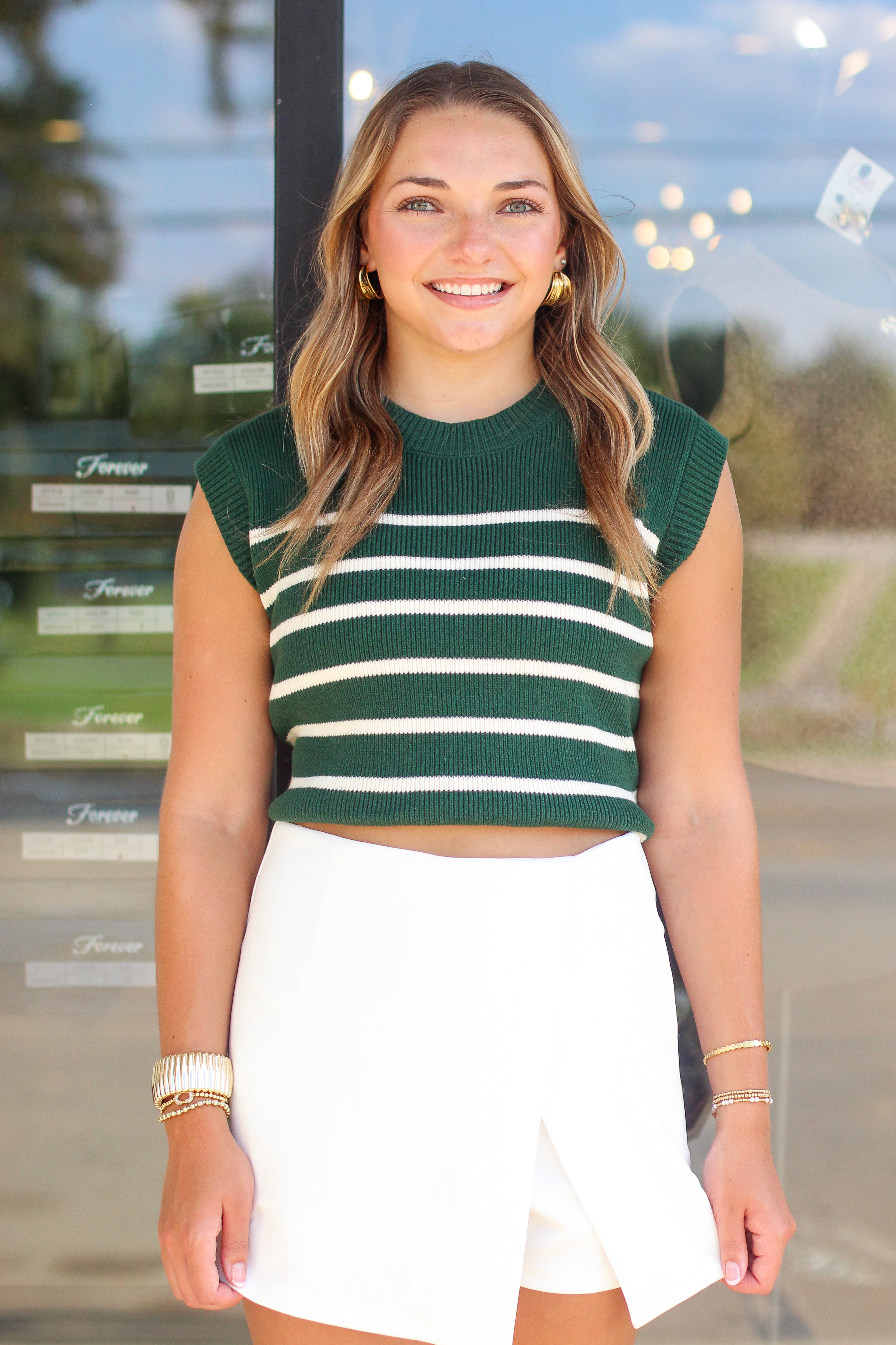 Looking for a versatile knit you can style through every season? This striped sleeveless sweater top combines classic stripes with a flattering, slightly cropped fit. Whether you pair it with shorts in the summer or layer it under a jacket in cooler weather, it’s the perfect throw-on-and-go piece for effortless style.