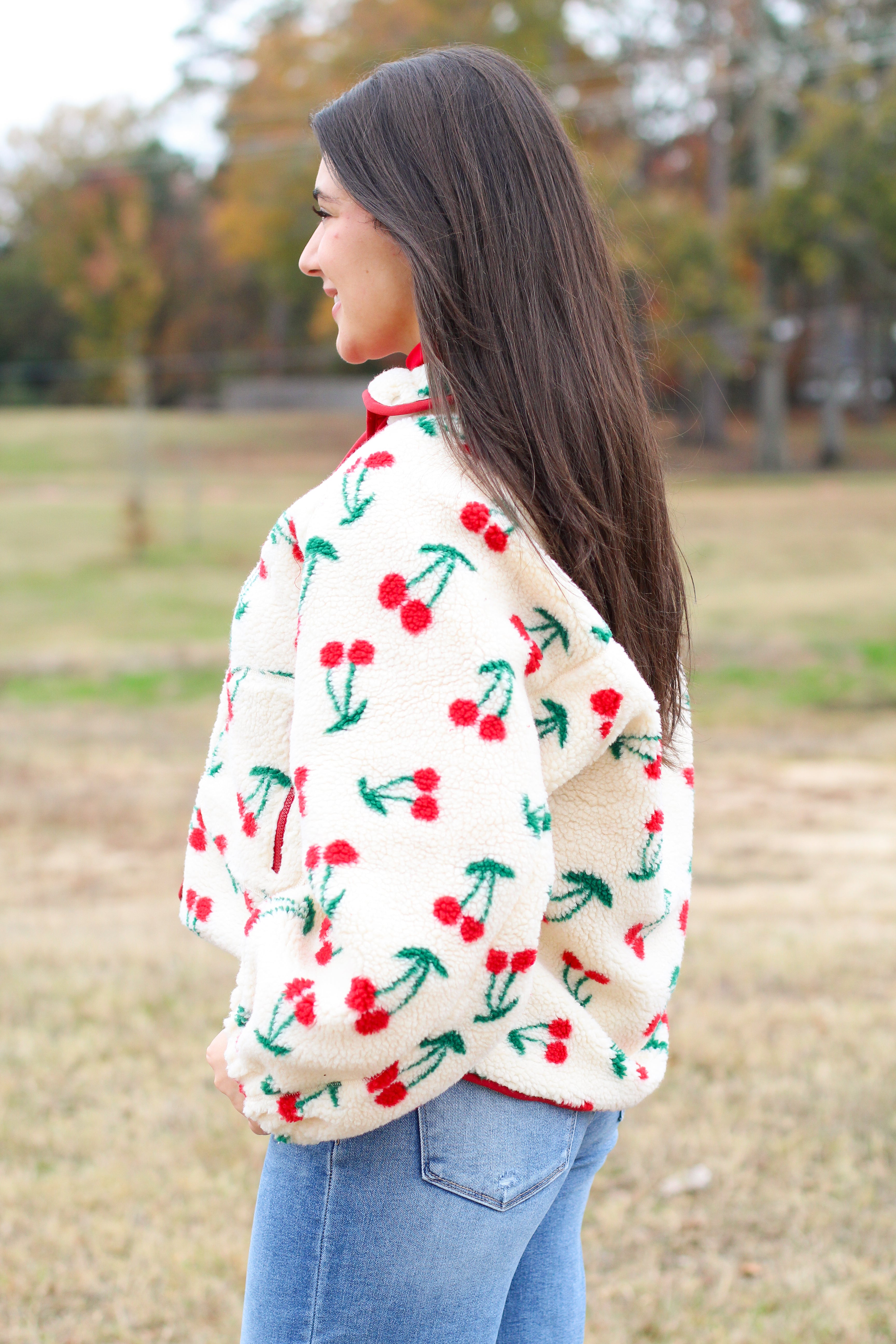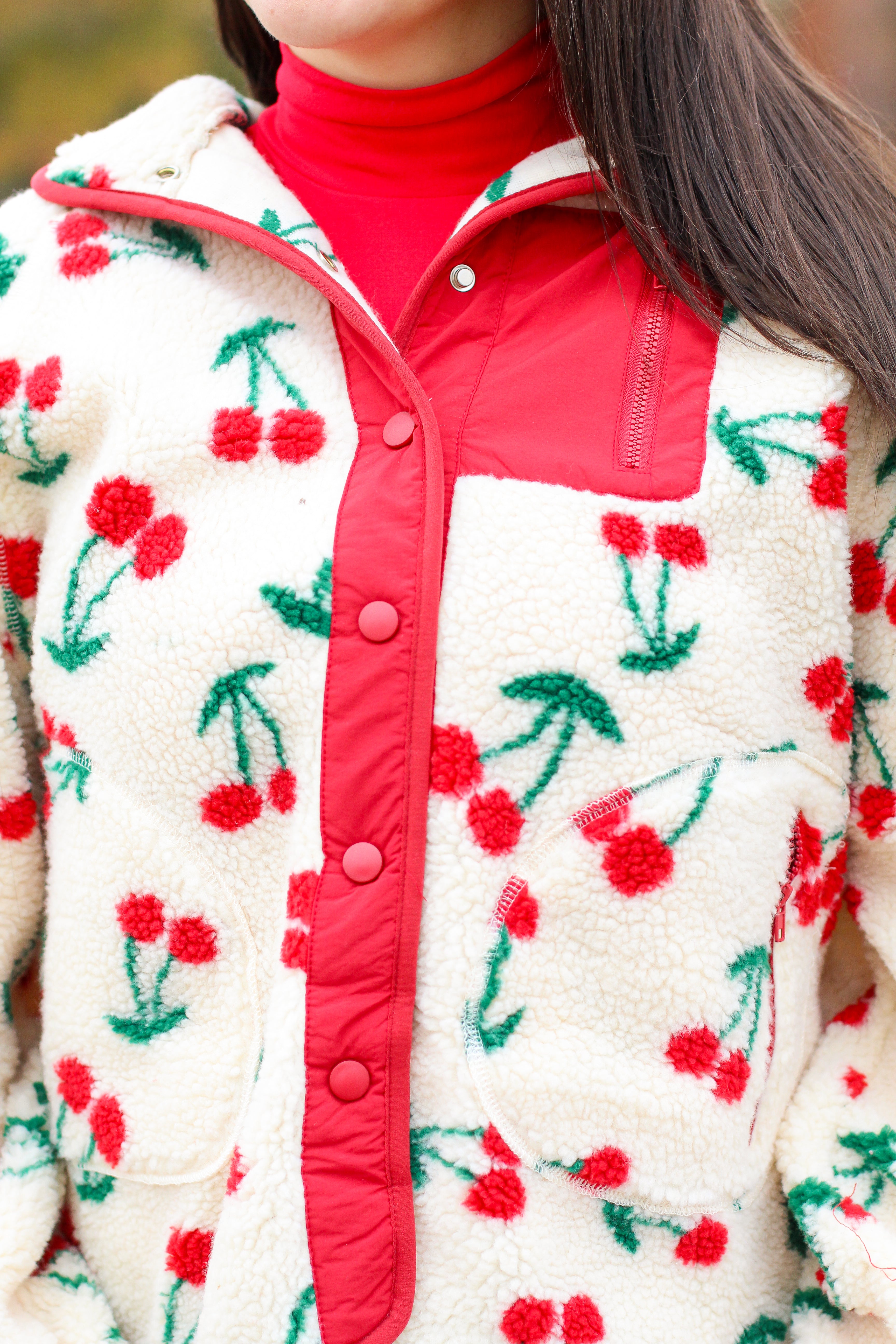 Add a fun pop of festive charm to your cold-weather wardrobe with this cherry print sherpa jacket. Featuring a cozy sherpa texture with bright cherry detailing and bold red accents, this jacket is both playful and practical. The snap-button front and contrast chest pocket give it a sporty feel, while the soft lining keeps you warm and comfy all season long.