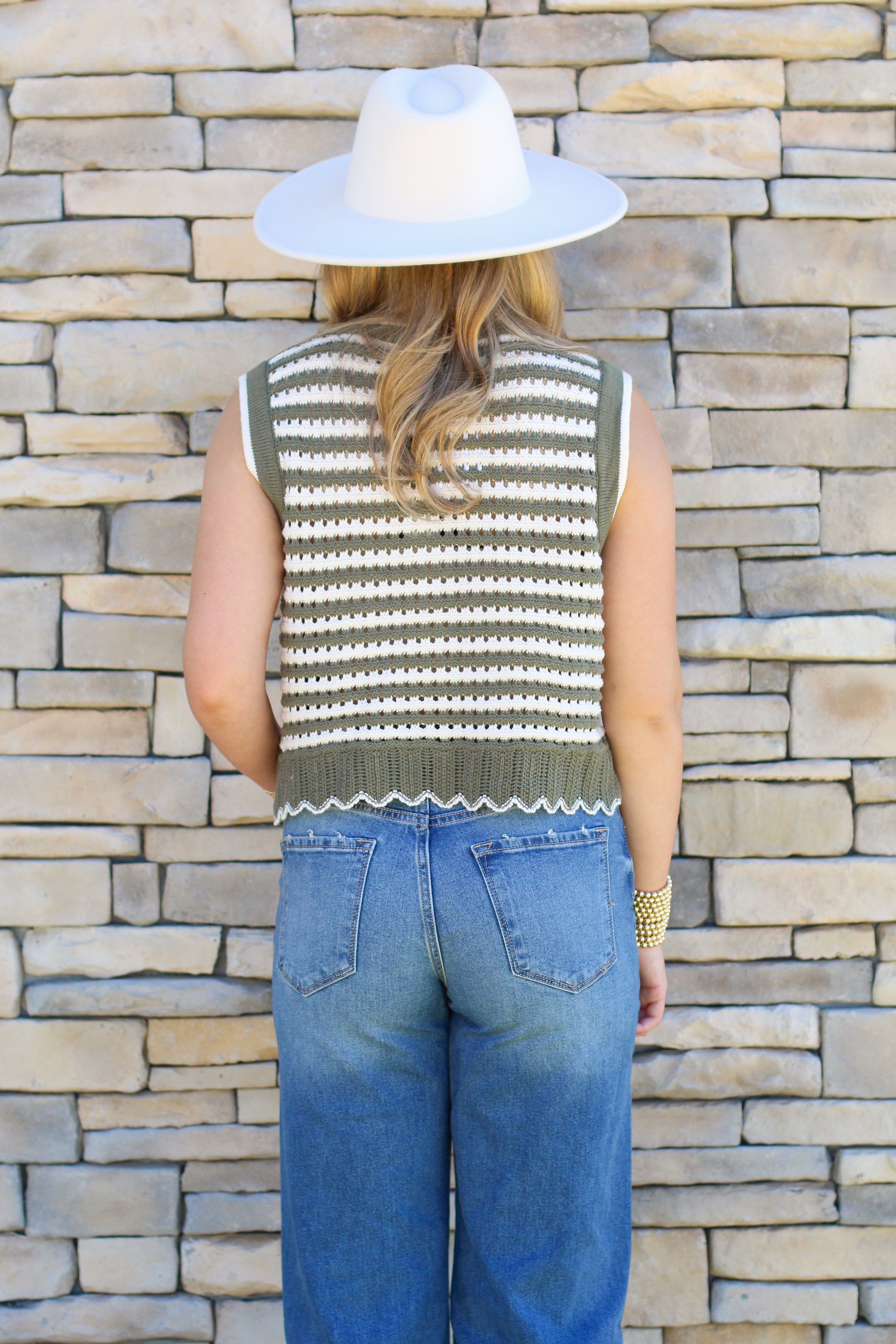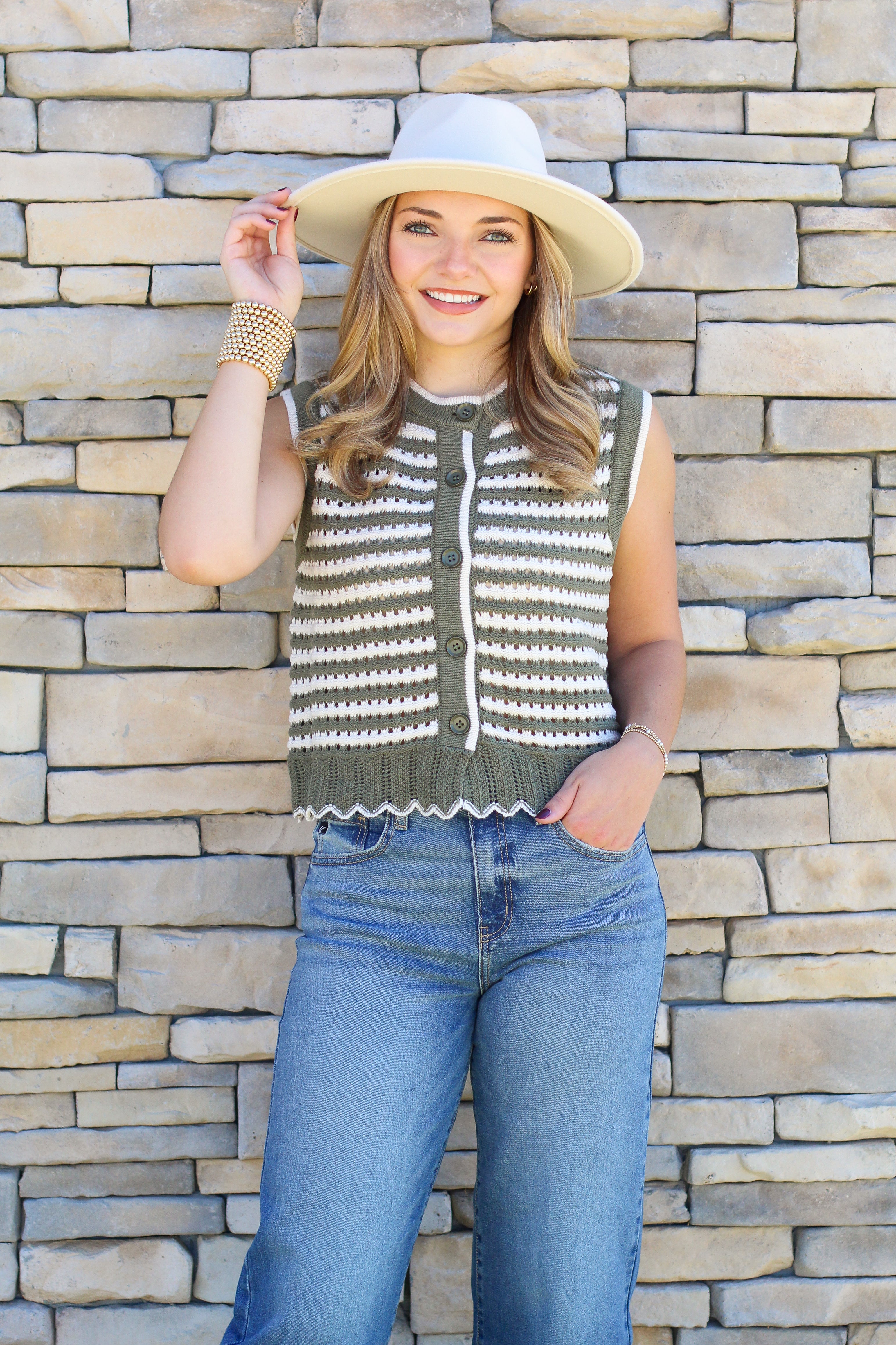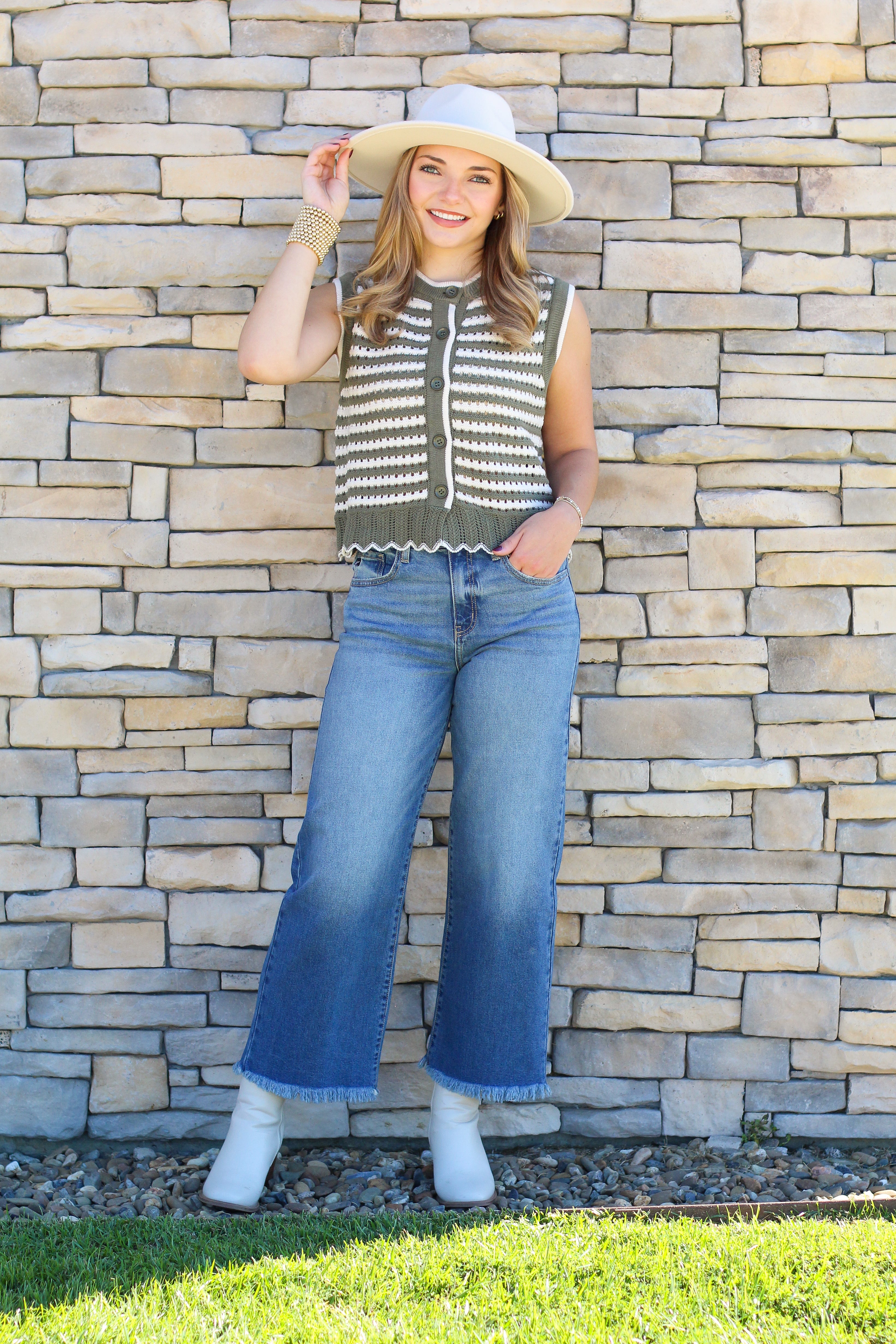 Add a touch of classic charm to your fall wardrobe with our Striped Button Sweater Vest! Featuring a timeless striped pattern with contrast trim, this vest gives effortless style whether layered over a long sleeve or worn on its own. The scalloped hem adds the sweetest feminine detail, while the button-front design keeps it versatile and easy to style. Available in two colors — olive/cream and black/cream — it’s the perfect pick for transitioning seasons.