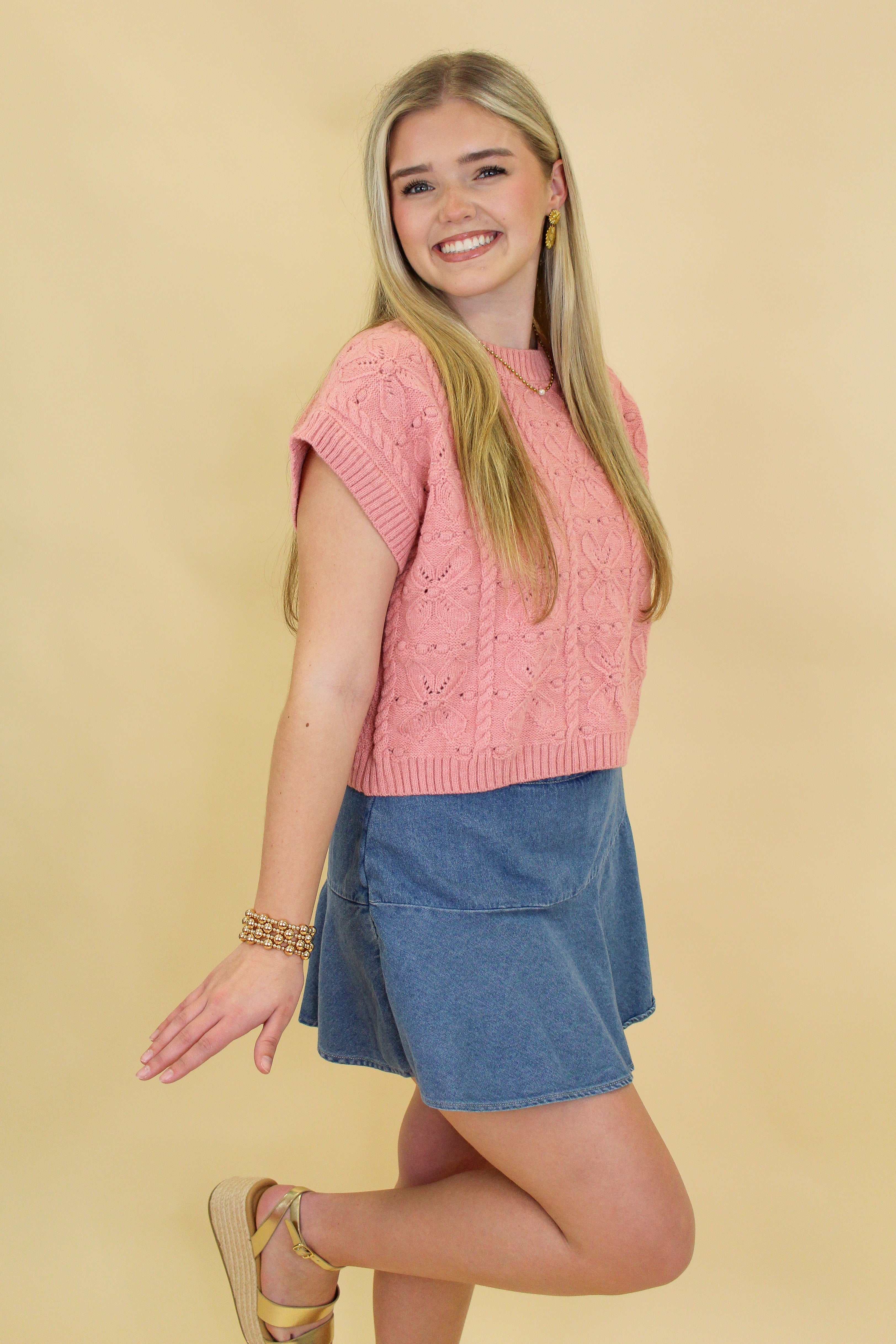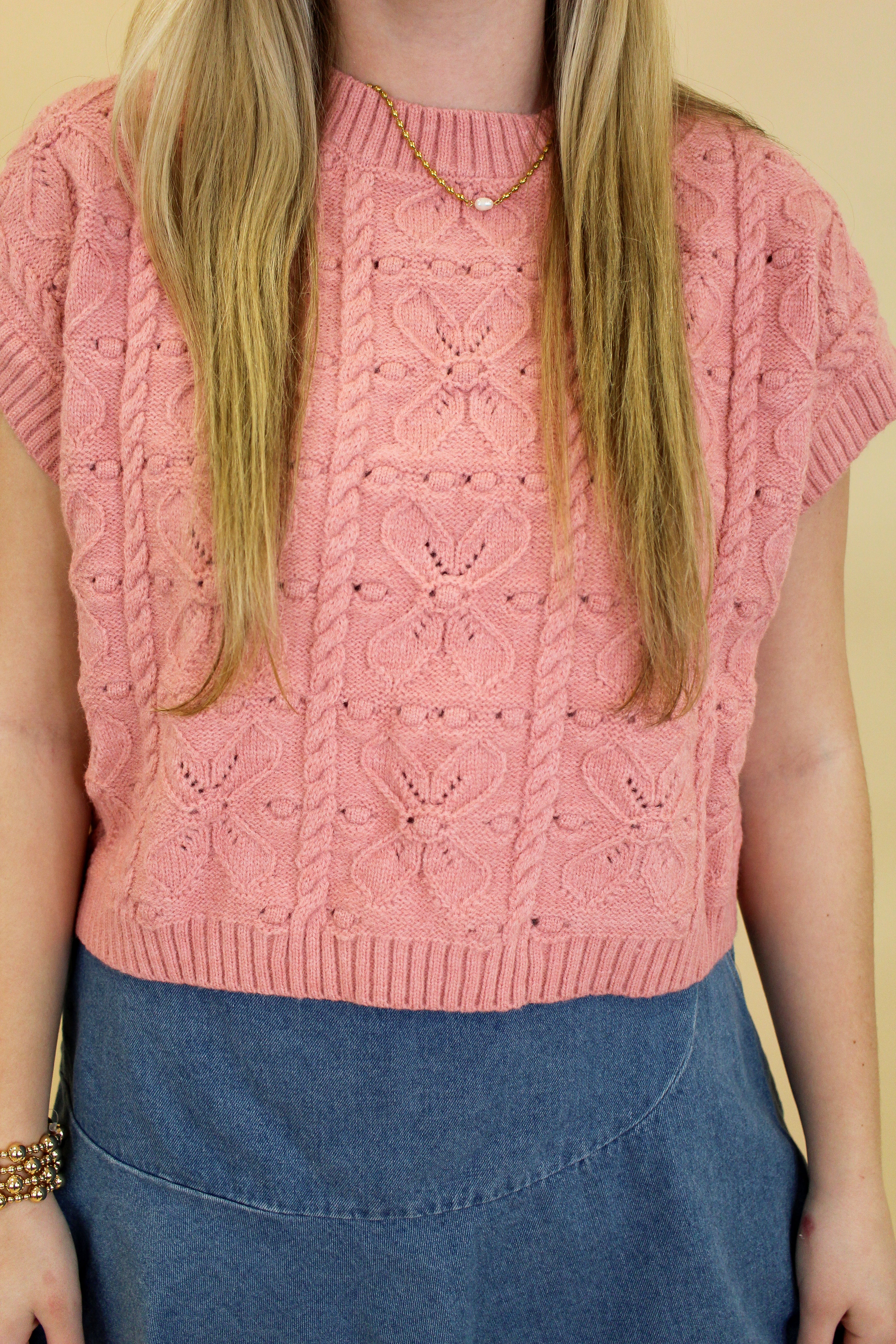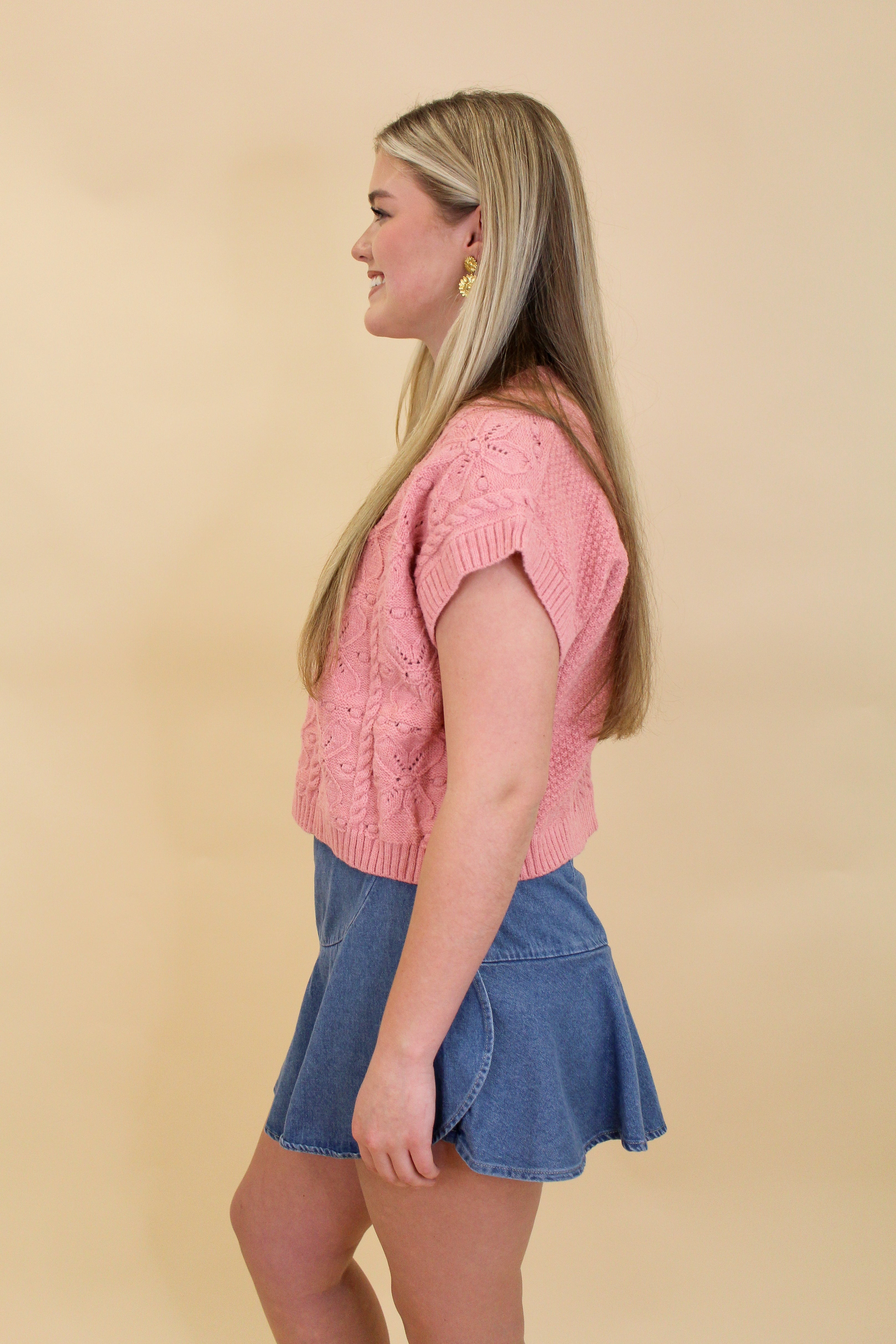 This pink knit sweater top is the sweetest blend of cozy and cute. Featuring an allover textured knit pattern with subtle heart-inspired detailing, it adds the perfect feminine touch to any outfit. The cap sleeves and slightly cropped length make it ideal for transitioning seasons, while the soft knit fabric keeps it comfortable all day long. Style it with denim skirts, high-rise jeans, or layered over a collared top for an effortless boutique look.