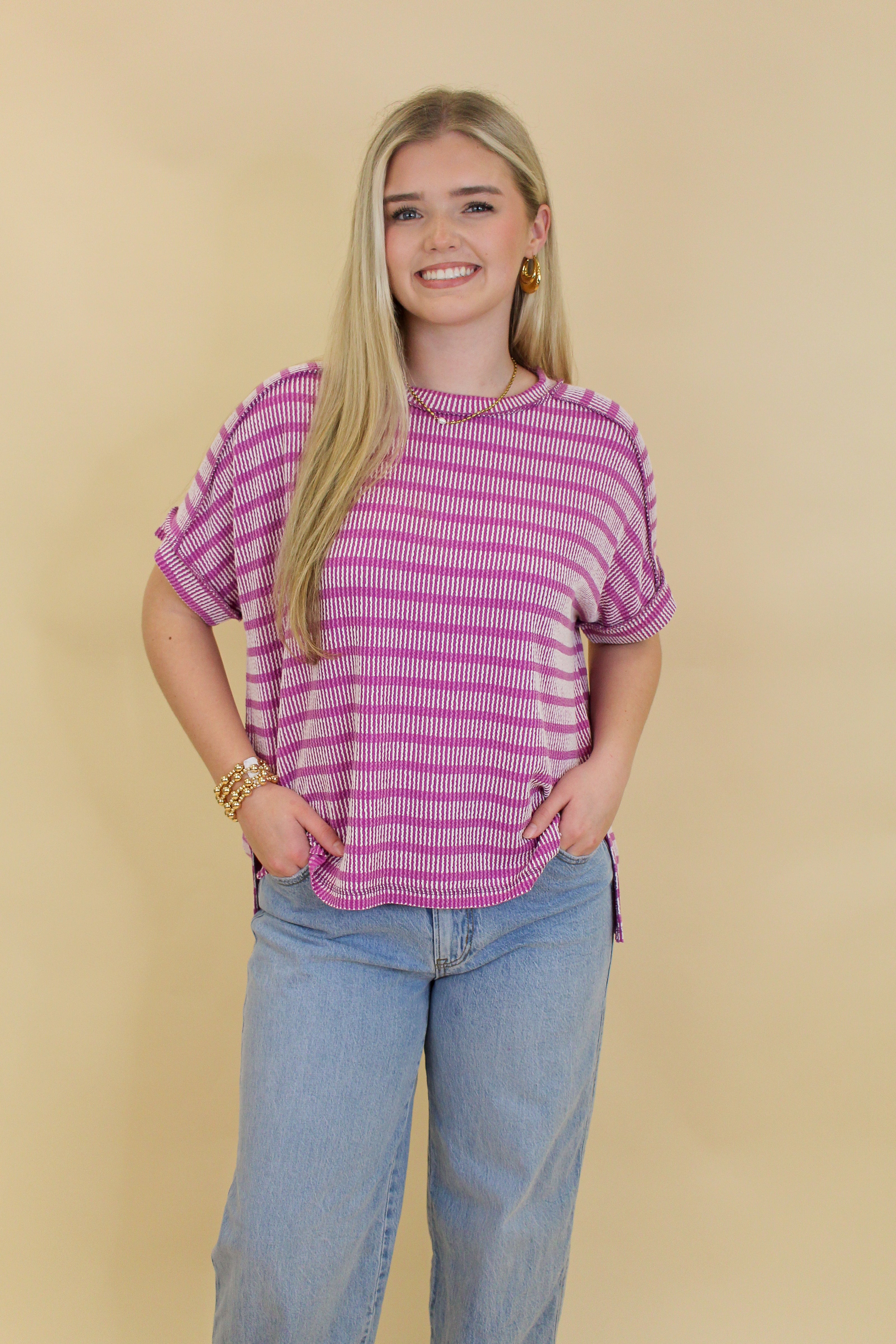 Add an easy pop of color to your everyday lineup with this must-have striped knit top! Featuring a soft ribbed texture, relaxed fit, and short sleeves, this piece is perfect for effortless styling year-round. The mustard and cream stripe combo brings just the right amount of brightness while still being super wearable. Dress it up with denim and wedges or keep it casual with sneakers for an easy, polished look.