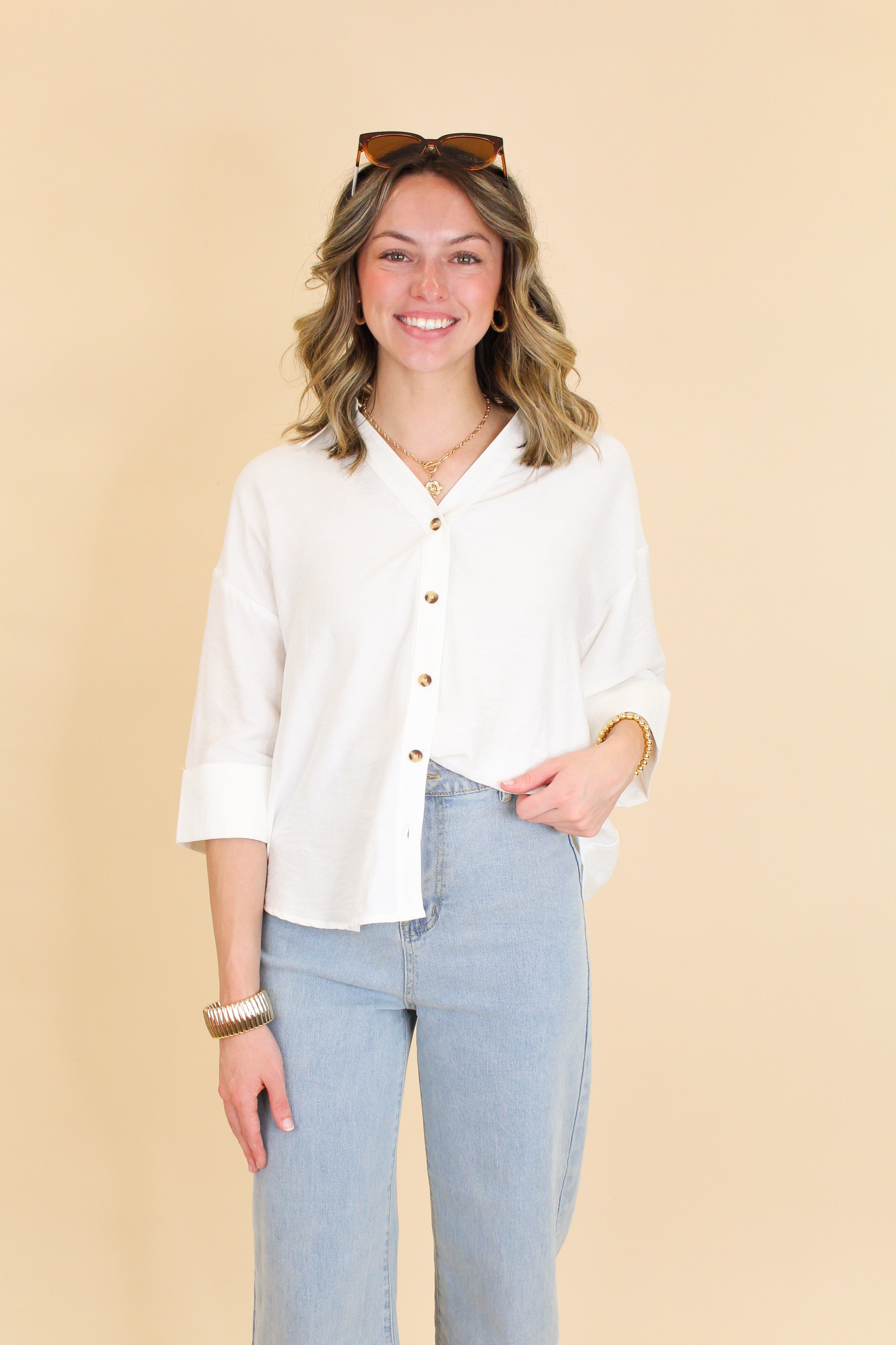 Say hello to your new wardrobe staple! This button-down blouse is effortlessly chic with a relaxed fit and cuffed sleeves that keep it casual yet elevated. Whether you wear it tucked, tied, or loose, it’s the kind of top that works with everything in your closet. Lightweight and breathable, it’s designed for comfort without sacrificing style.