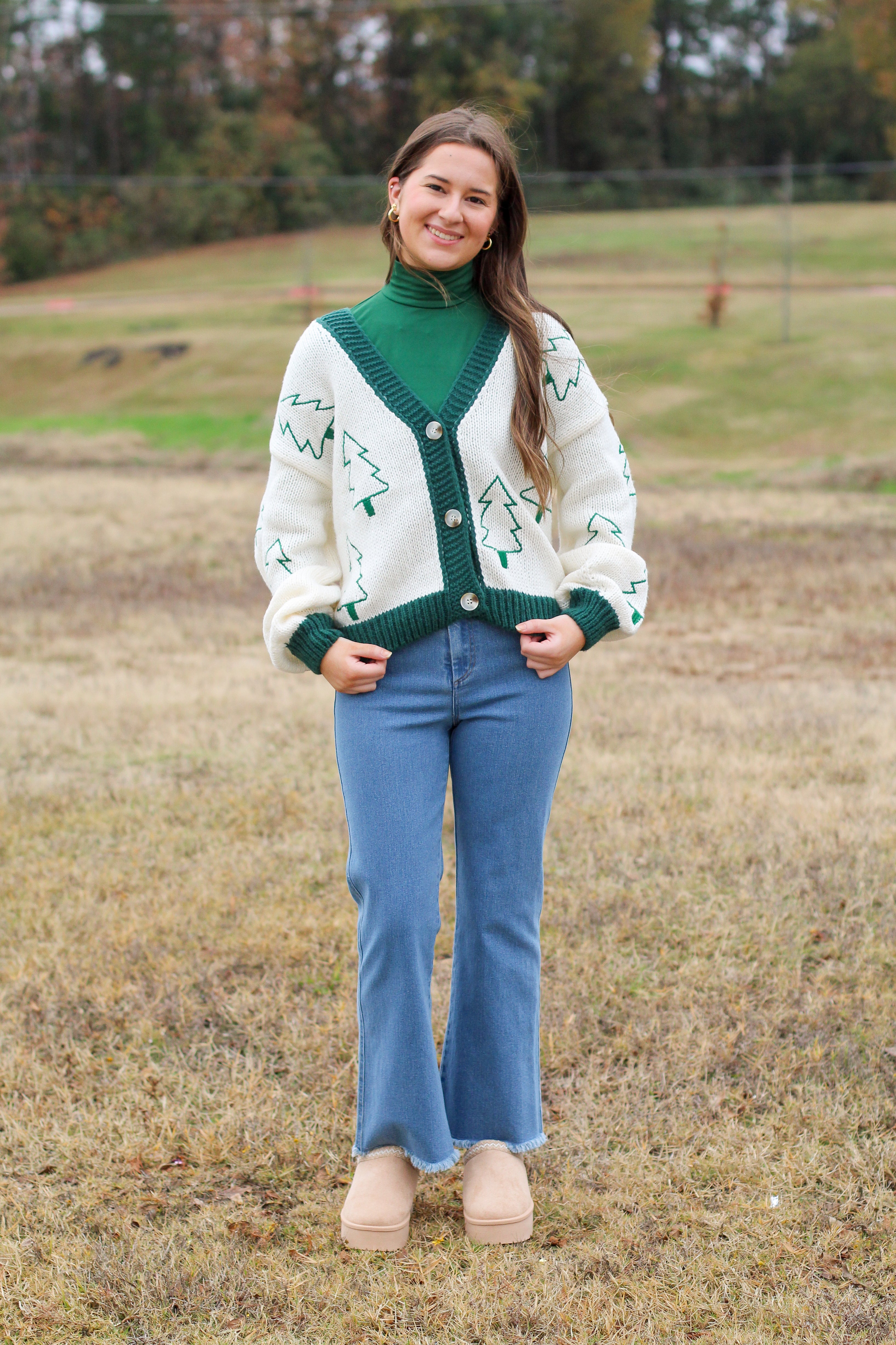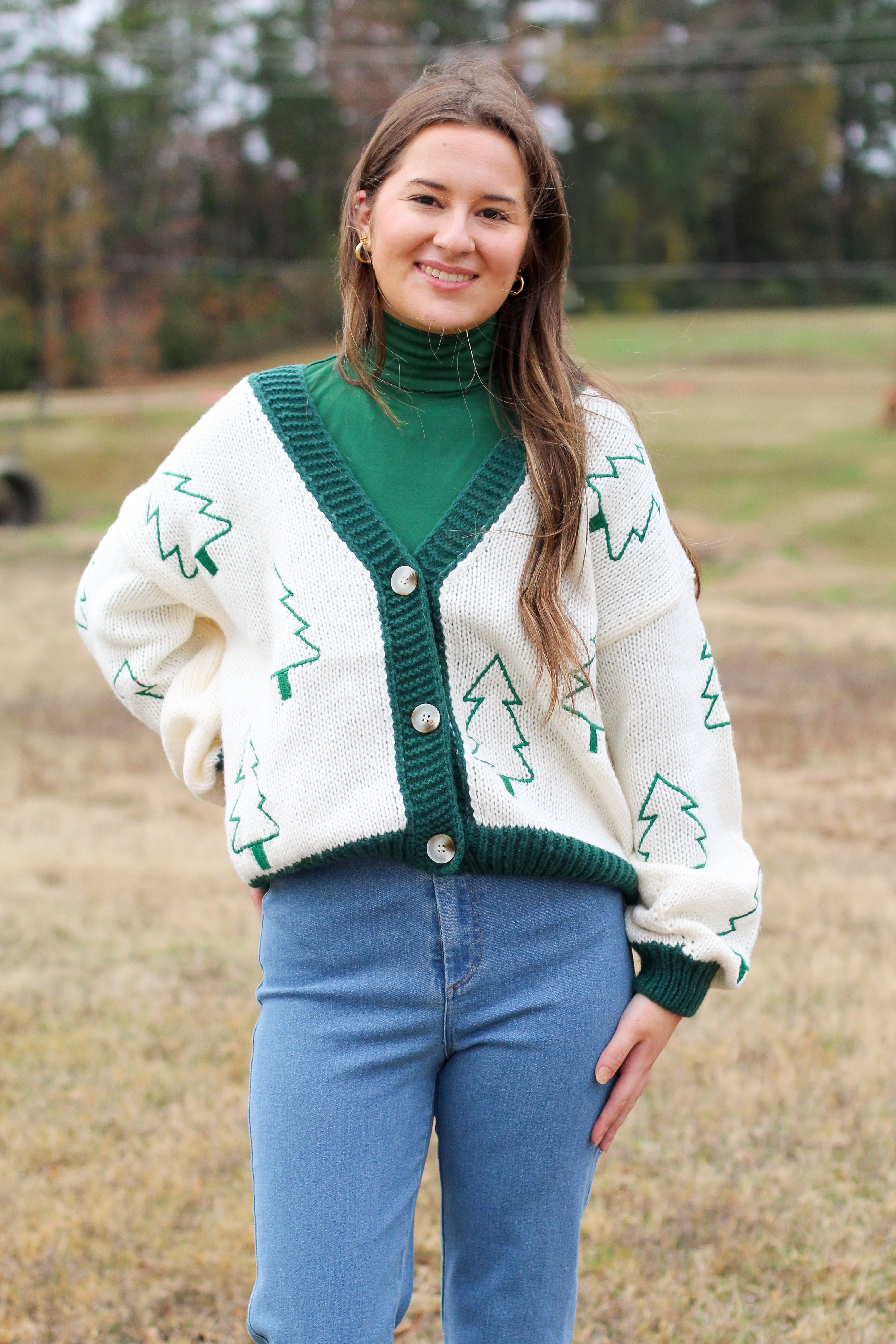 Get into the holiday spirit with this charming Christmas tree cardigan. Featuring a soft cream knit with green tree detailing and contrasting green trim, this cardigan is finished with a button-front design for easy layering. It’s the perfect cozy piece to throw on for festive outings, casual holiday gatherings, or Christmas morning.