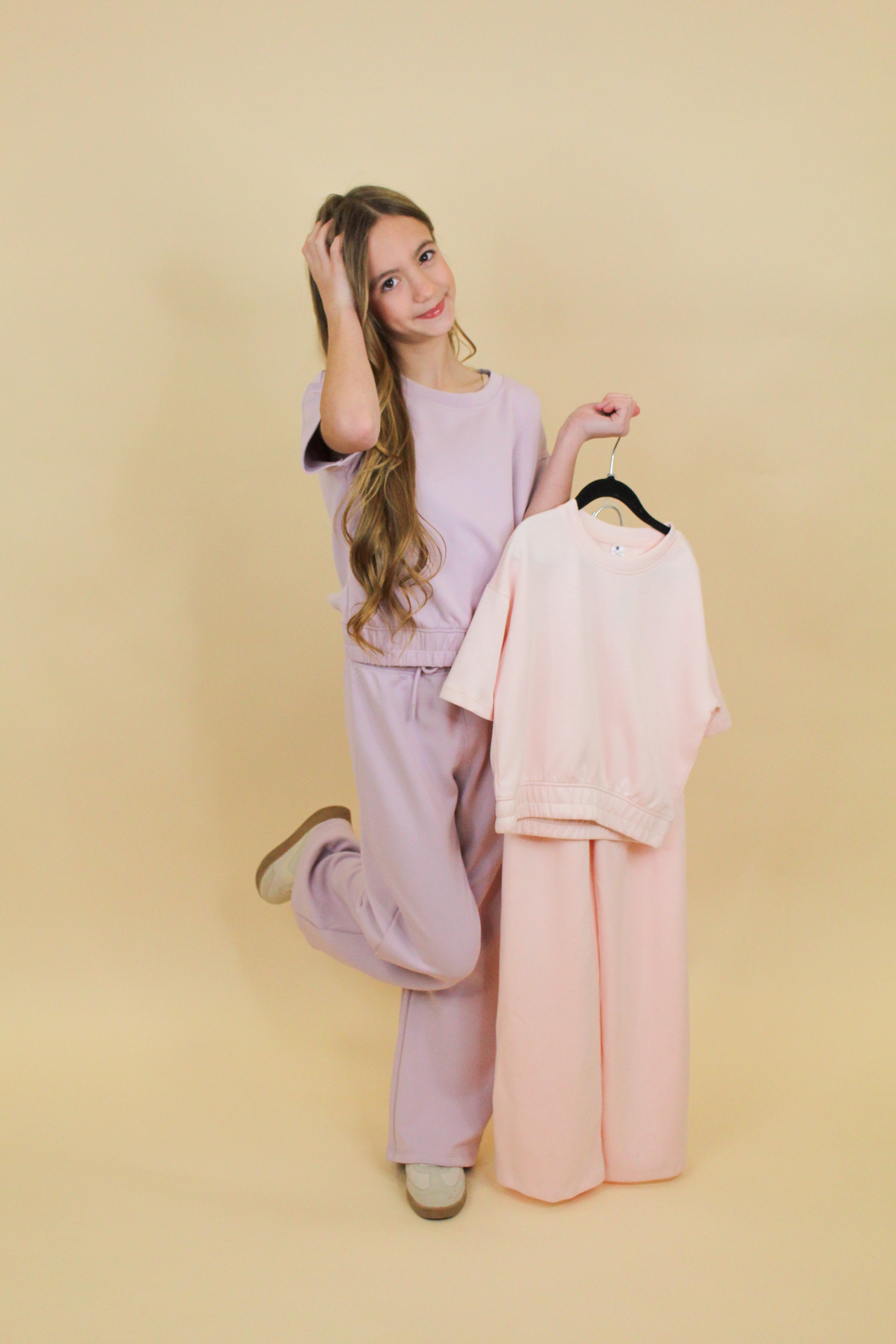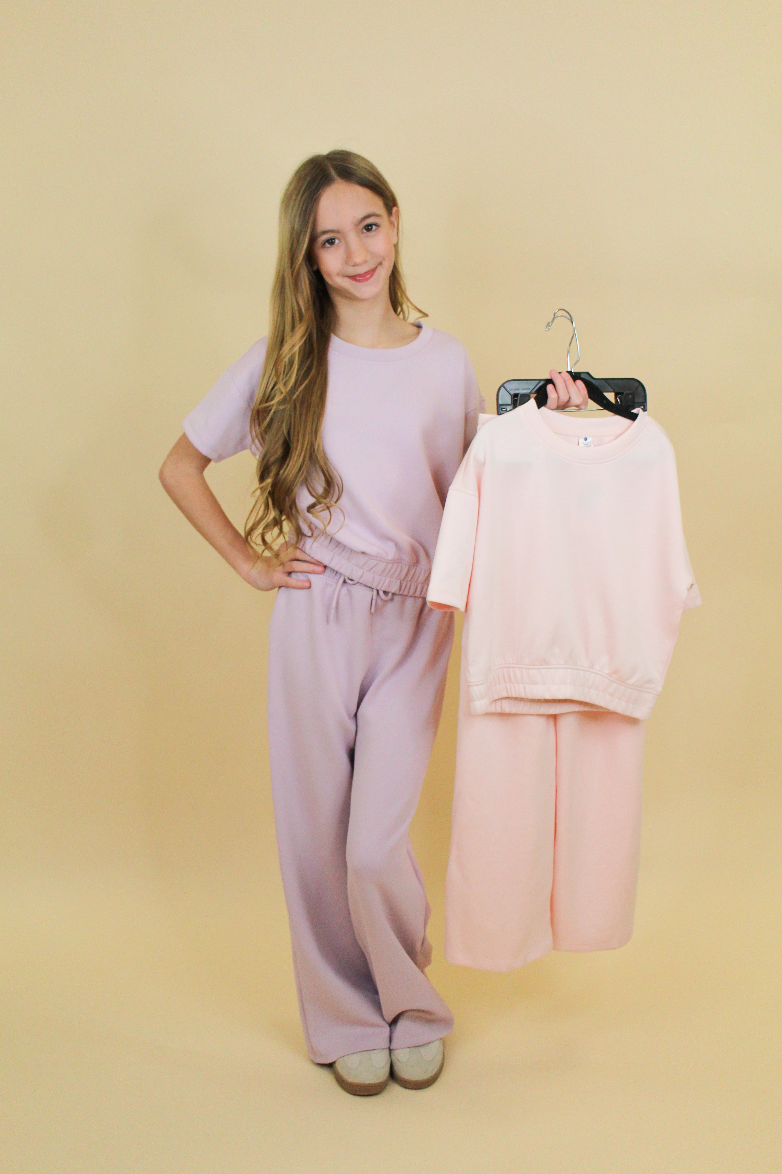 The ultimate comfy-cute set your girl will live in. This soft pastel lounge set is made for all-day comfort while still looking polished and put together. The relaxed short sleeve top pairs perfectly with the matching elastic-waist pants for an easy, effortless outfit she can wear at home, to school events, or out and about.