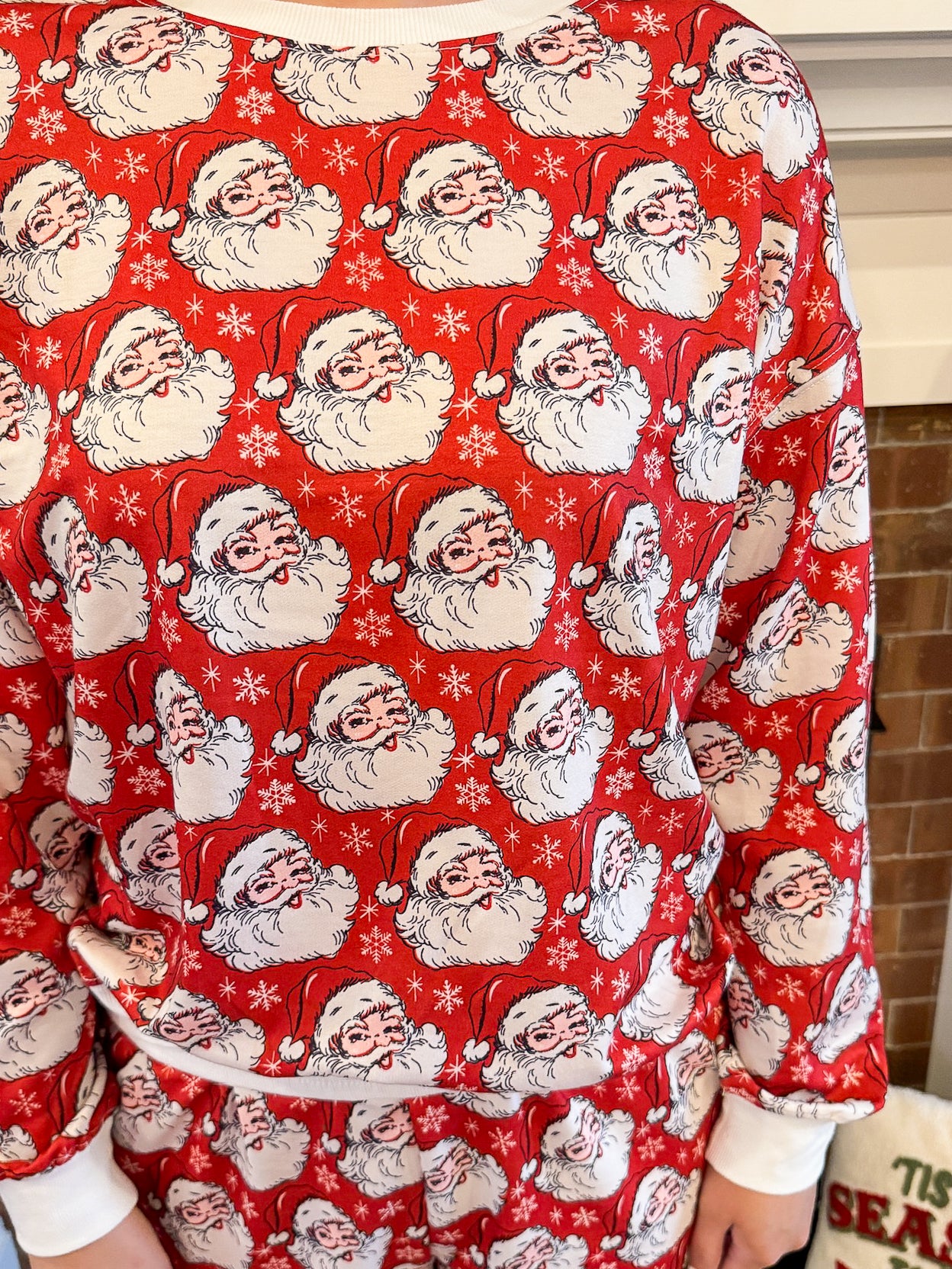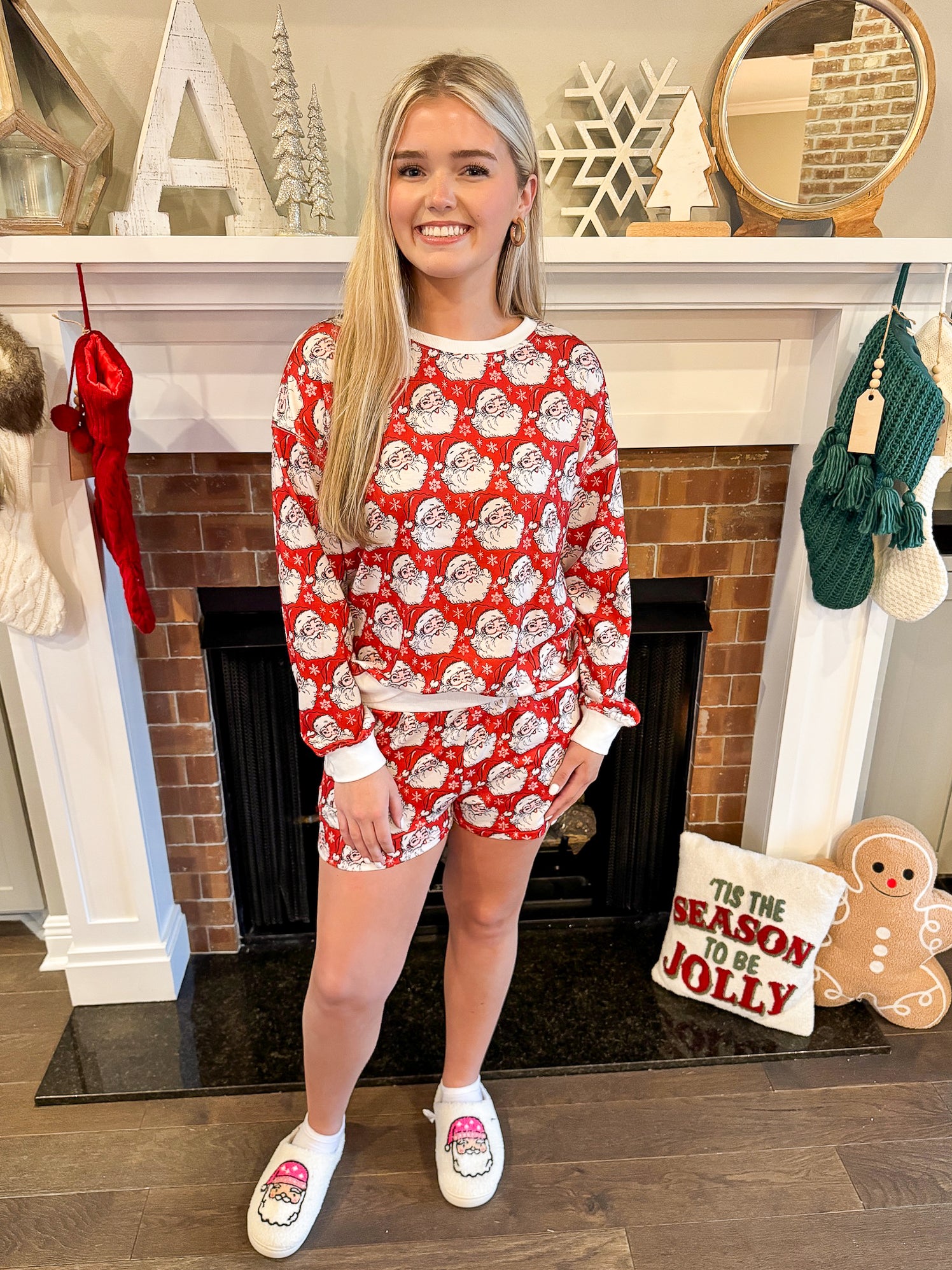 Get cozy and Christmas-ready with the cutest festive pajamas of the season! This Santa print lounge set is made from an ultra-soft, stretchy knit that feels just as comfy as it looks cheerful. The long-sleeve top pairs perfectly with the relaxed shorts, both featuring a joyful all-over Santa pattern that brings instant holiday spirit.