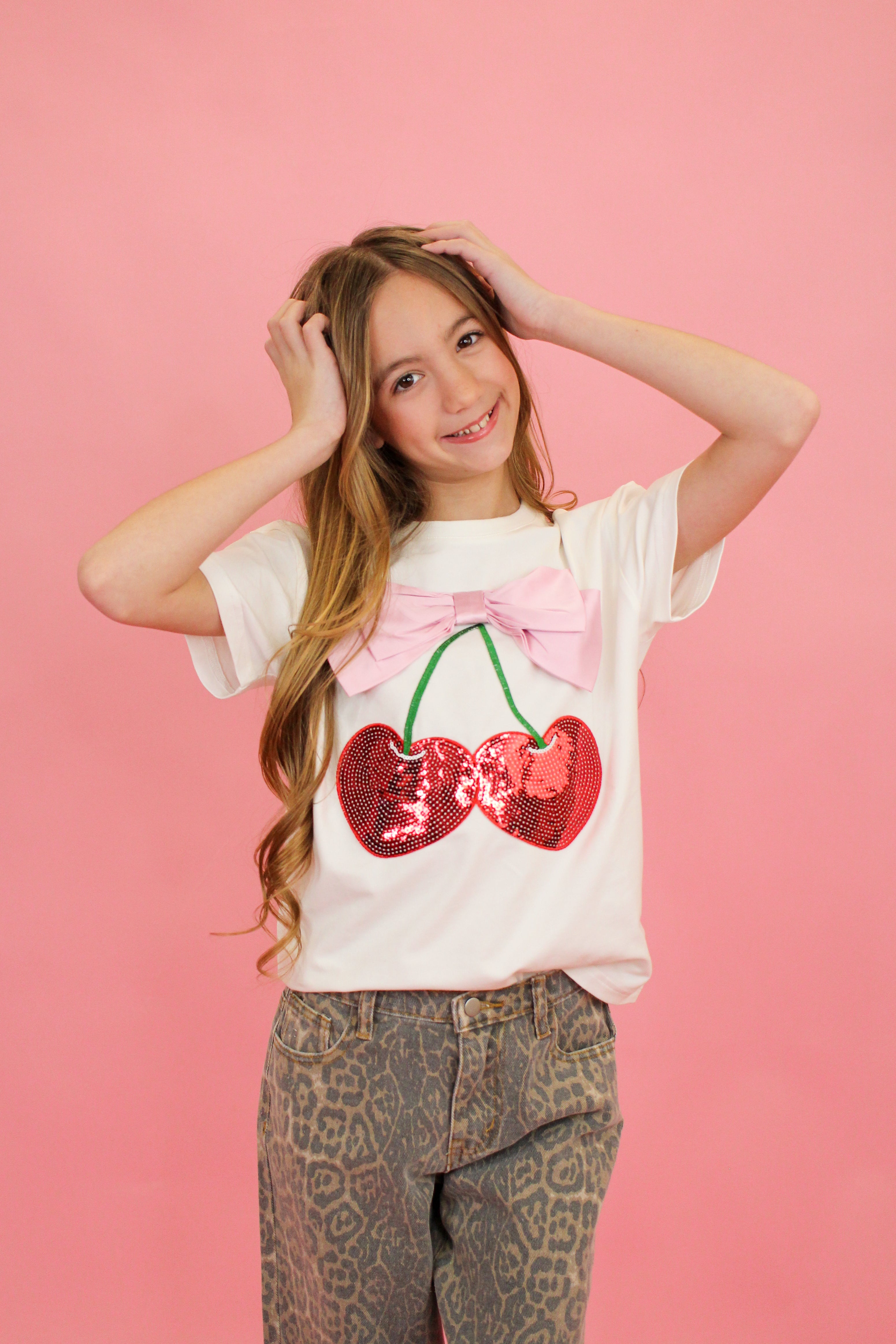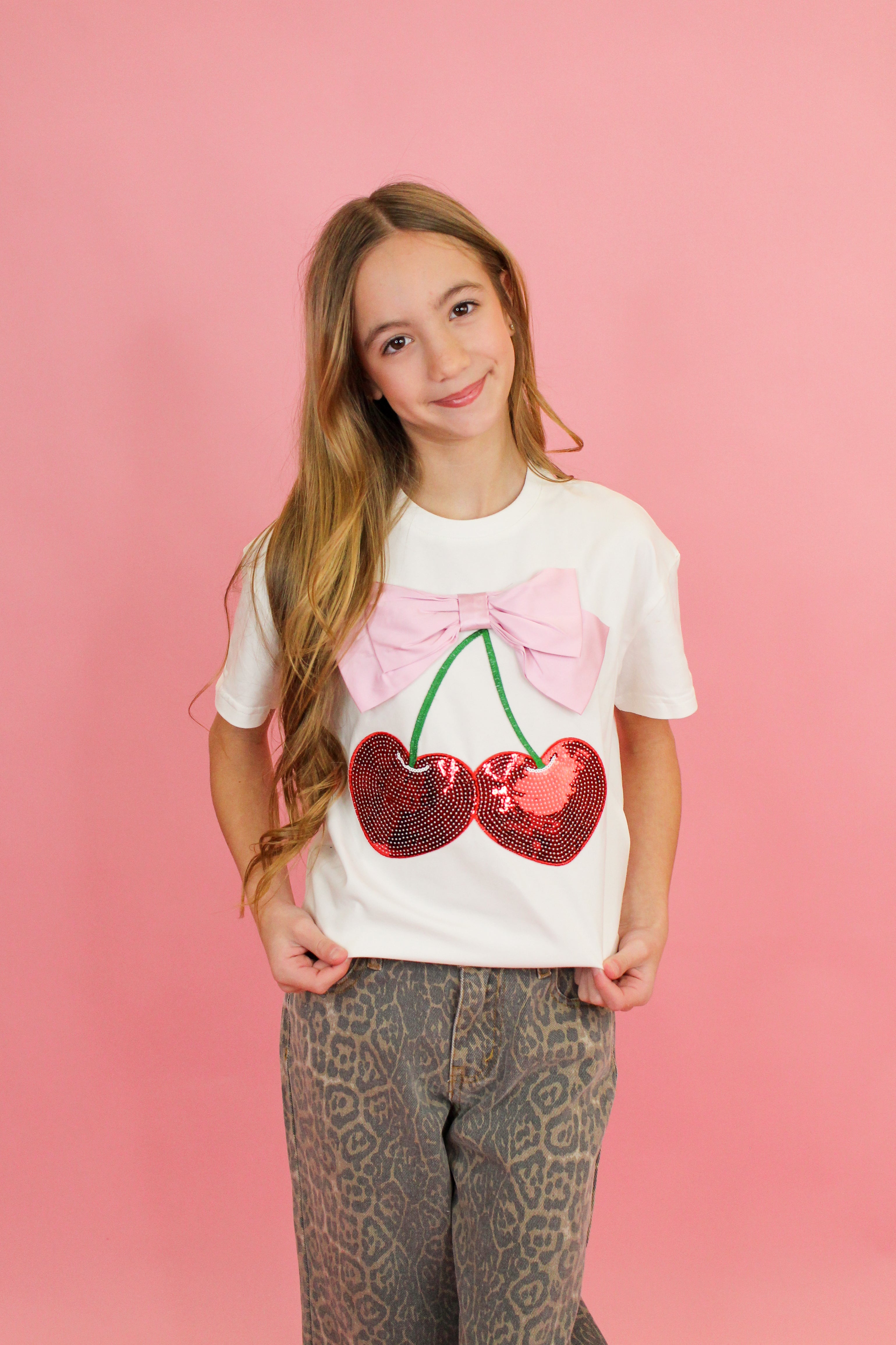 This cherry bow top is the sweetest statement piece your little trendsetter will love! Featuring a fun sequin cherry graphic with a soft pink bow detail, this top adds the perfect pop of sparkle and charm to any outfit. The relaxed fit keeps it comfy while still looking cute, making it easy to pair with jeans, skirts, or shorts for an effortlessly adorable look.