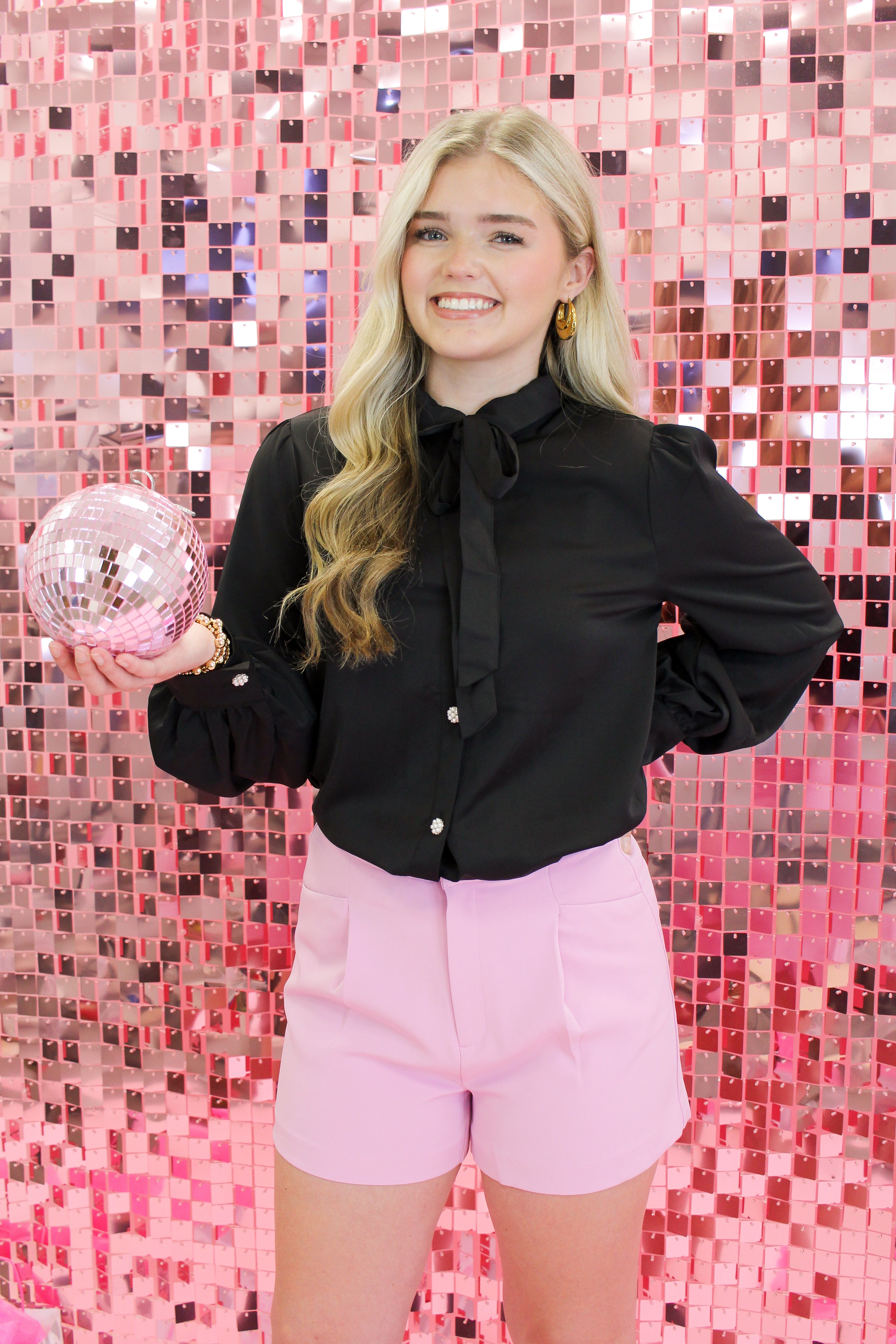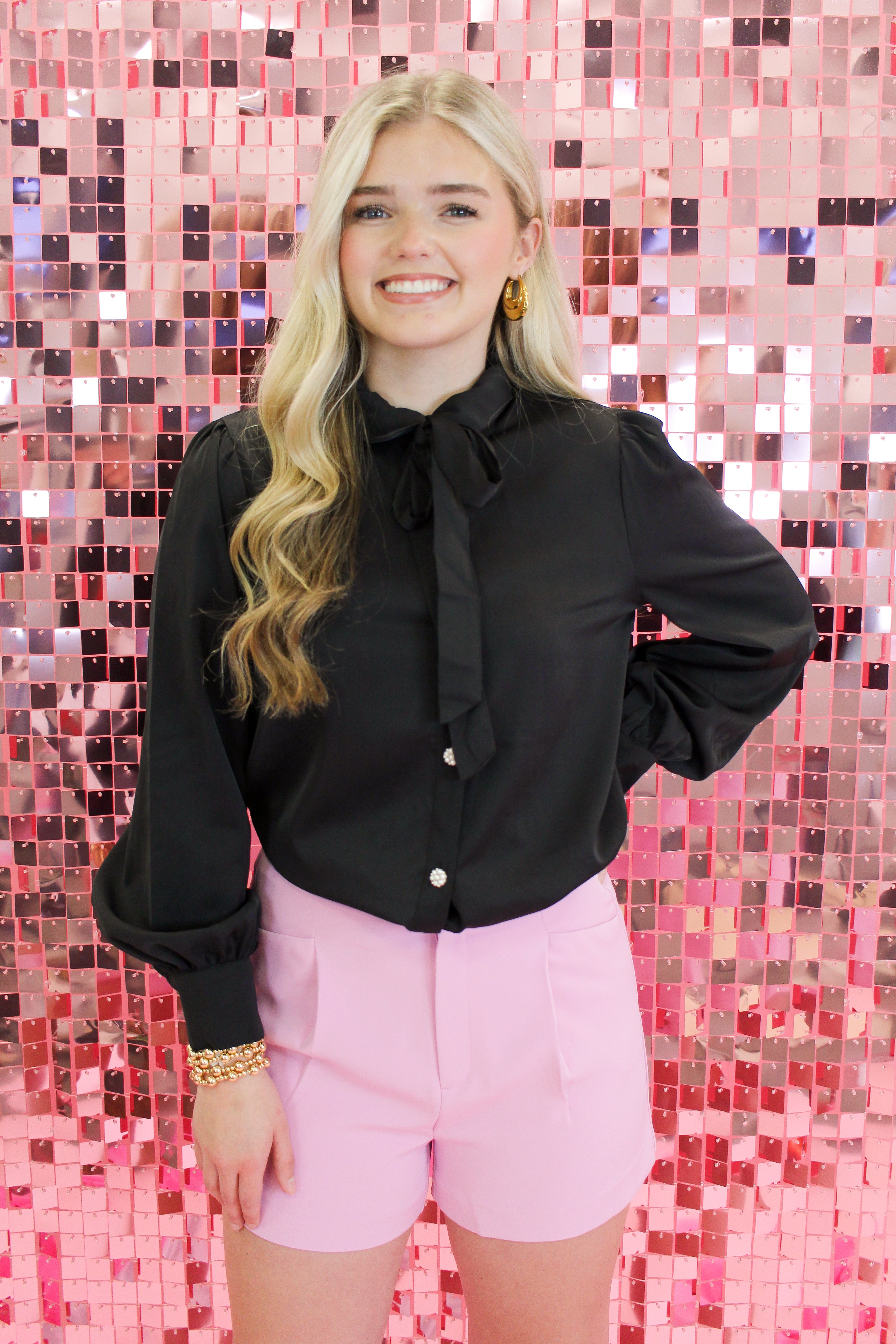 This bow tie blouse is the definition of effortless sophistication. Featuring a soft drape, statement neck tie, and delicate button-front detail, it’s perfect for dressing up workwear or elevating a casual look.