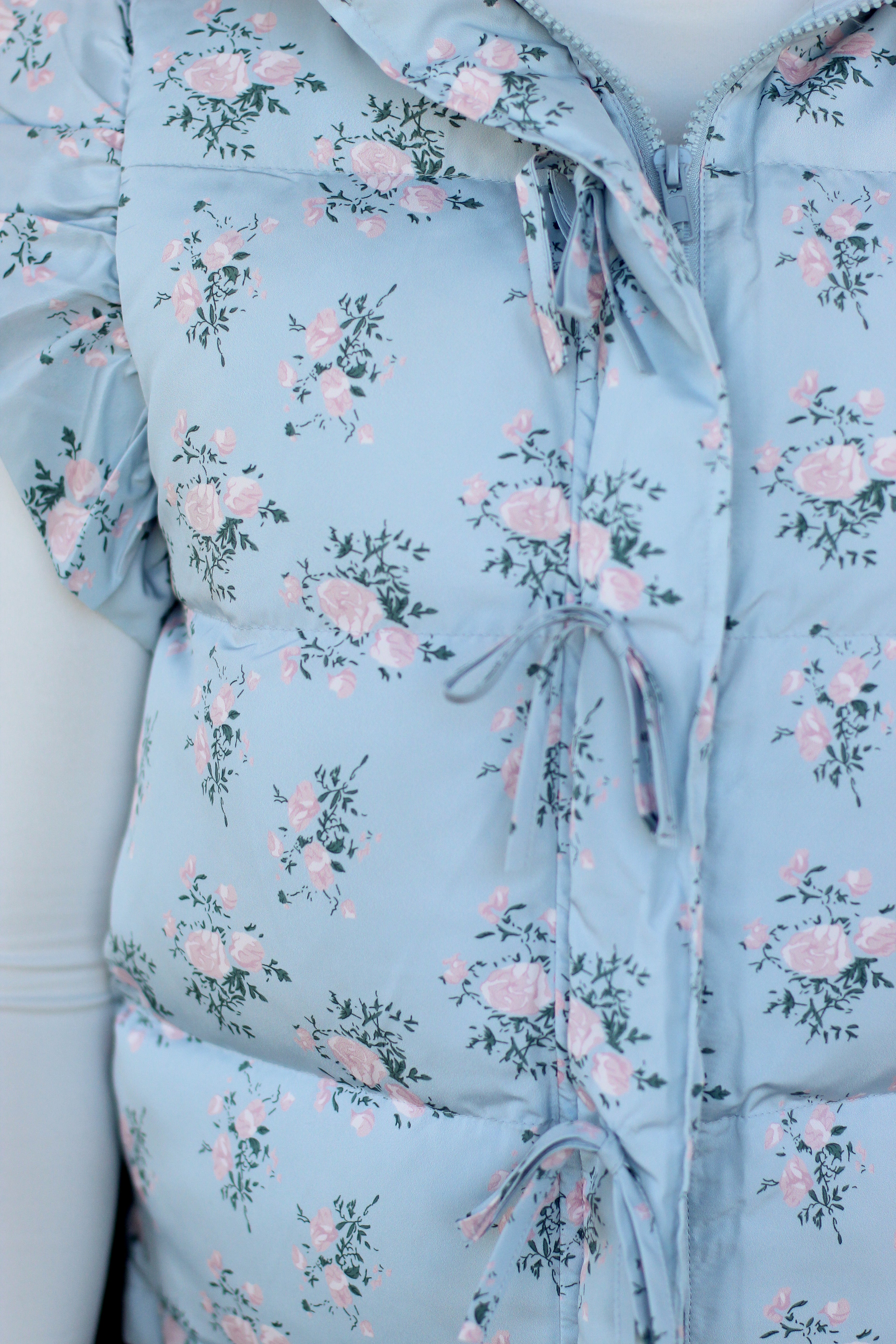 Say hello to the sweetest layer of the season! This floral puffer vest features a soft pastel bouquet print with darling ruffle-trimmed shoulders that add the perfect feminine touch. Whether you tie it closed or leave it open, it brings charm and personality to any outfit. Lightweight enough for daily wear but still warm for cooler days — it’s the ideal throw-on-and-go piece.