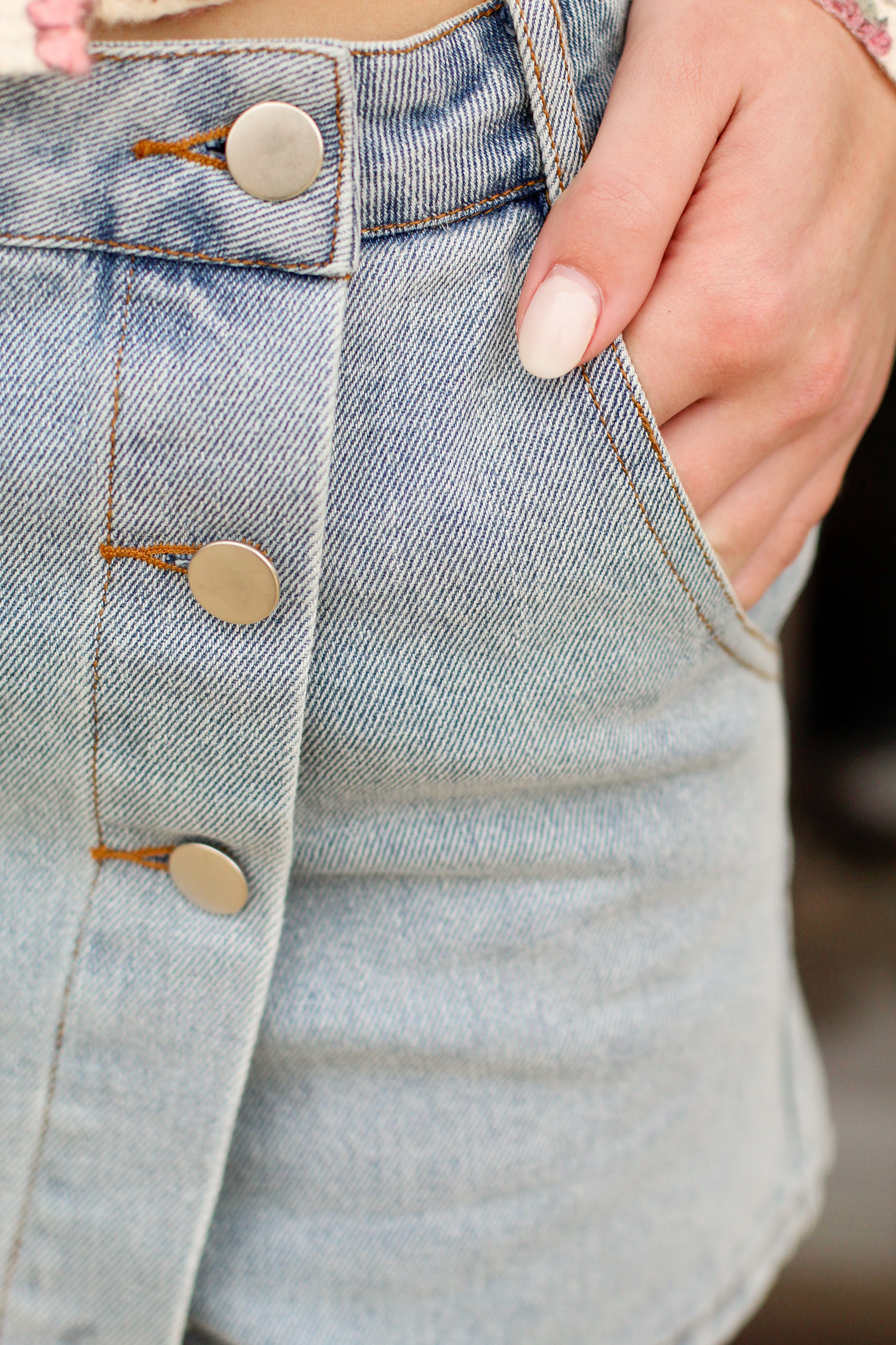This denim skort is the perfect mix of cute and practical. Featuring a wrap-front skirt look with hidden shorts underneath, it gives you the style of a skirt with the comfort and confidence of shorts. The button-front detail adds a flattering touch, while the soft denim keeps it easy to wear all day. Dress it up with a blouse or keep it casual with a tee — this one does it all.