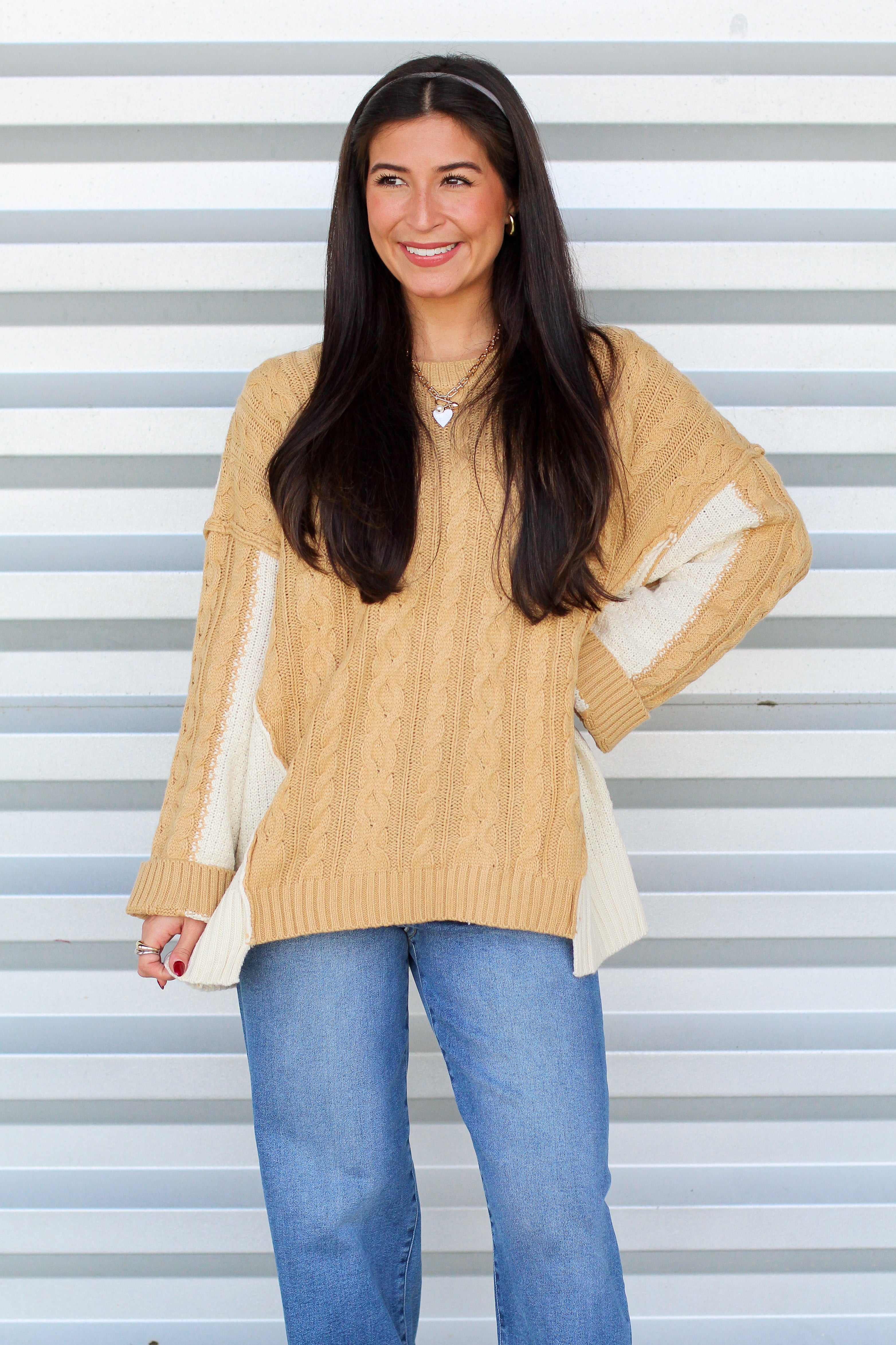 Cozy meets classic in this must-have neutral sweater! Featuring a soft cable-knit front with contrasting cream details, this relaxed-fit sweater is perfect for effortless everyday wear. The neutral tones make it easy to dress up or down—pair it with denim for a casual day out or layer it for cooler temps. Comfortable, timeless, and so easy to style, this one will be on repeat all season long.
