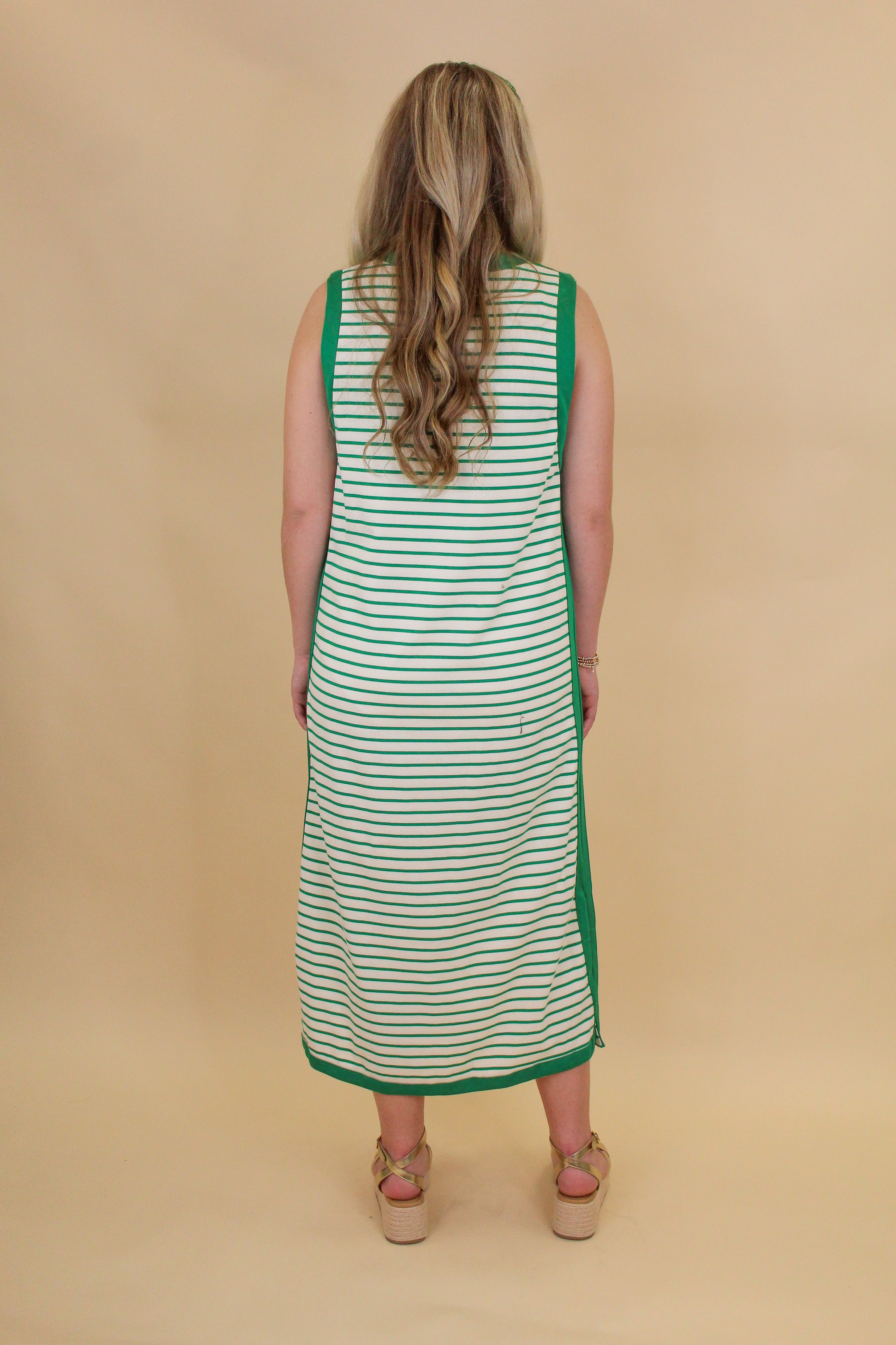 Classic stripes never go out of style — and this sleeveless midi dress is the perfect everyday staple. Featuring a timeless striped pattern with contrast trim along the neckline and armholes, it gives you a polished look with effortless comfort. The straight, relaxed silhouette makes it easy to throw on and go.