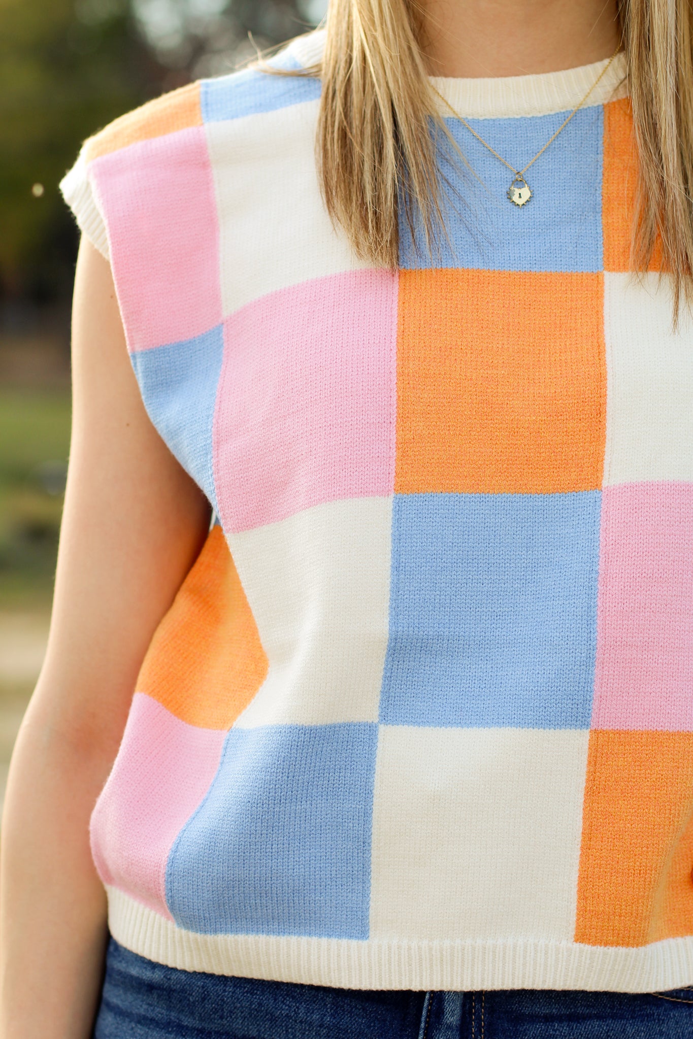 Add a pop of playful color to your wardrobe with our Pastel Checkered Sweater Vest! This soft knit top features a bold checkerboard pattern in dreamy pastel hues of orange, blue, pink, and cream. Perfect for layering or wearing solo, it’s a cheerful piece that brings instant sunshine to any outfit.