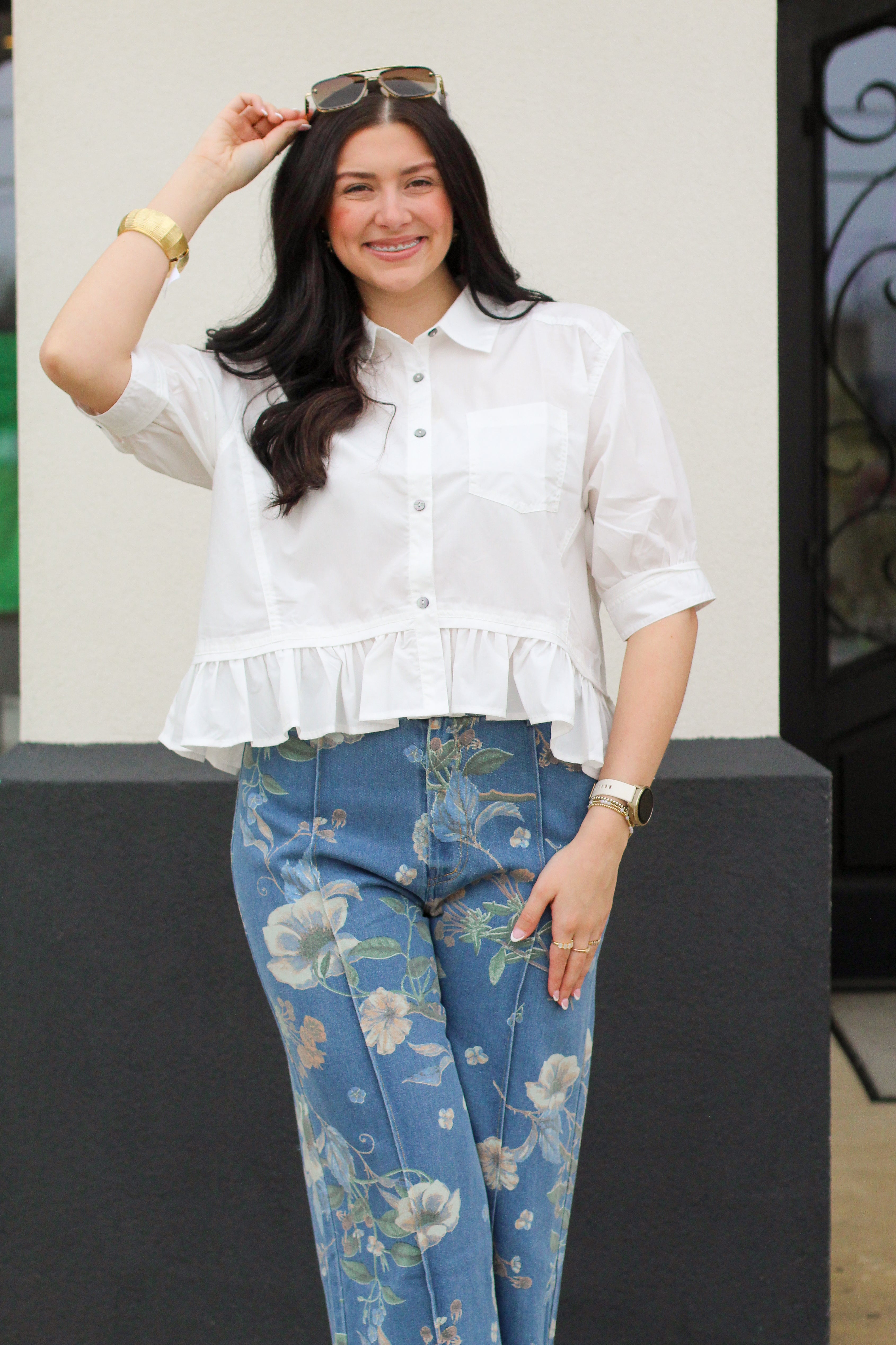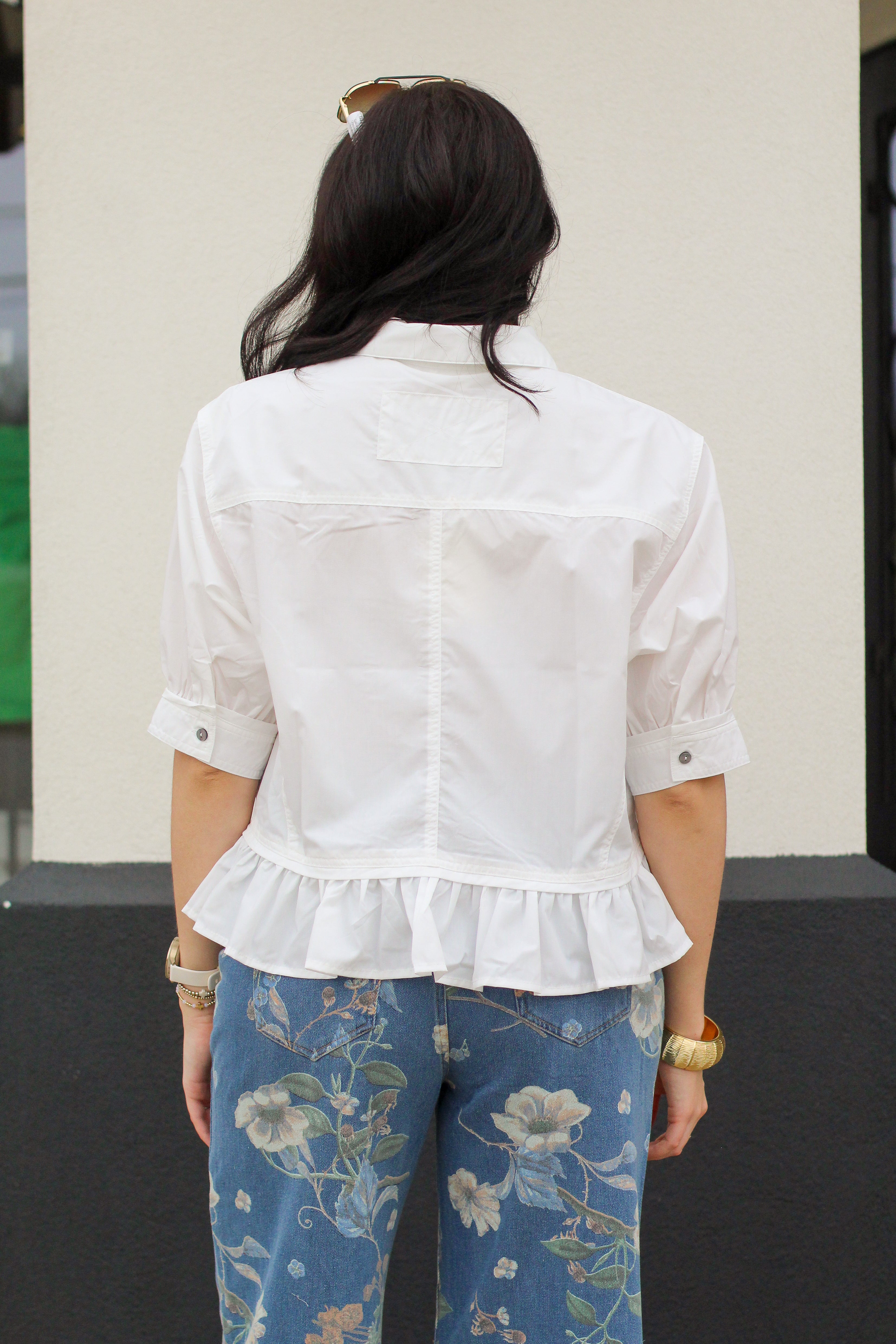 The tailored button-front design gives it a polished feel, while the soft ruffle hem adds just the right amount of movement and charm. It pairs beautifully with denim, printed pants, or skirts — making it a versatile piece you’ll reach for again and again, whether you’re dressing it up or keeping it casual. ✨