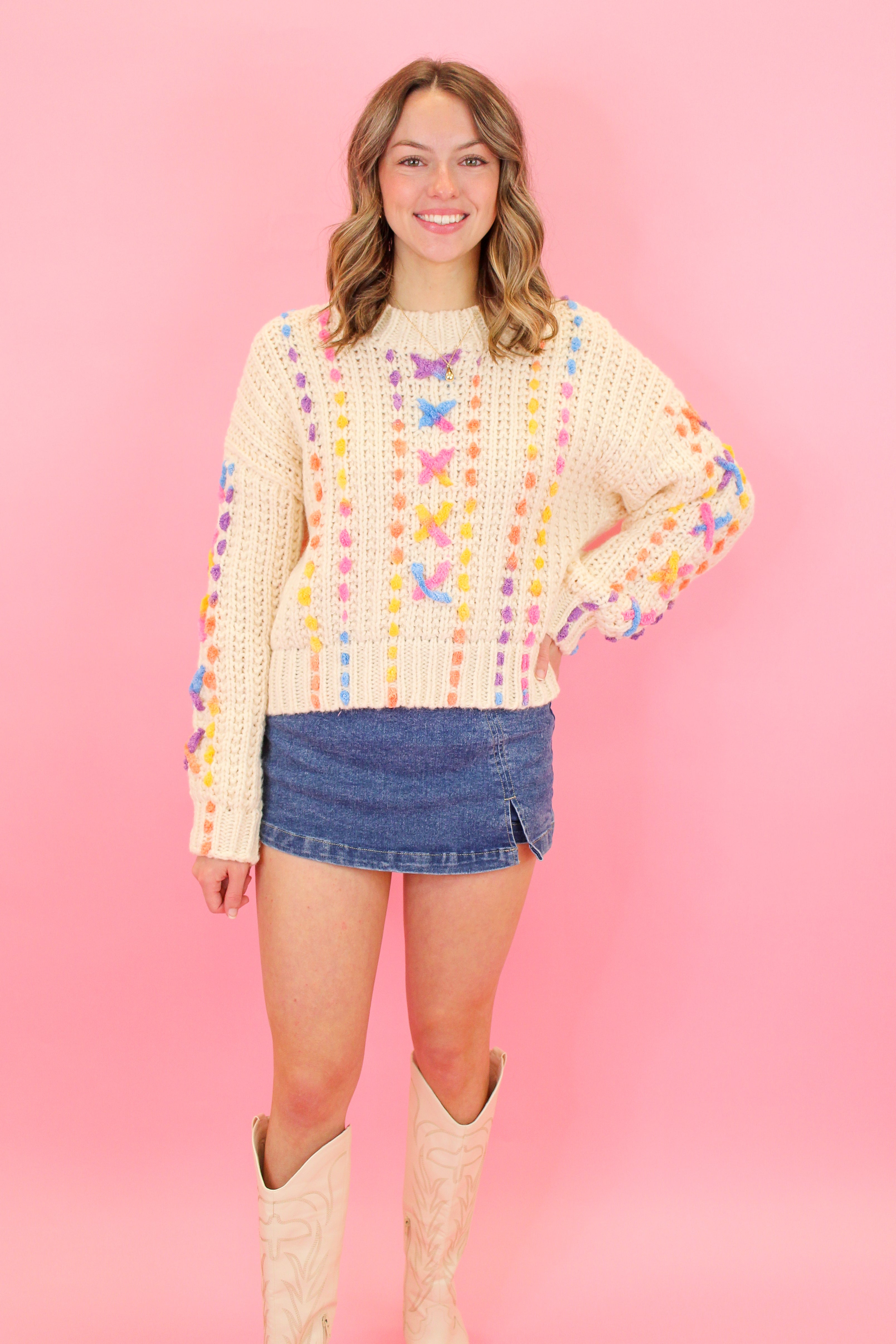Brighten up your wardrobe with this cozy, cheerful knit! The Colorful Star Embroidered Sweater brings playful charm to chilly days with its multicolor stitched stars and dots that pop against a soft neutral base. It’s fun, feminine, and the ultimate mood-booster piece your closet’s been missing.Materials