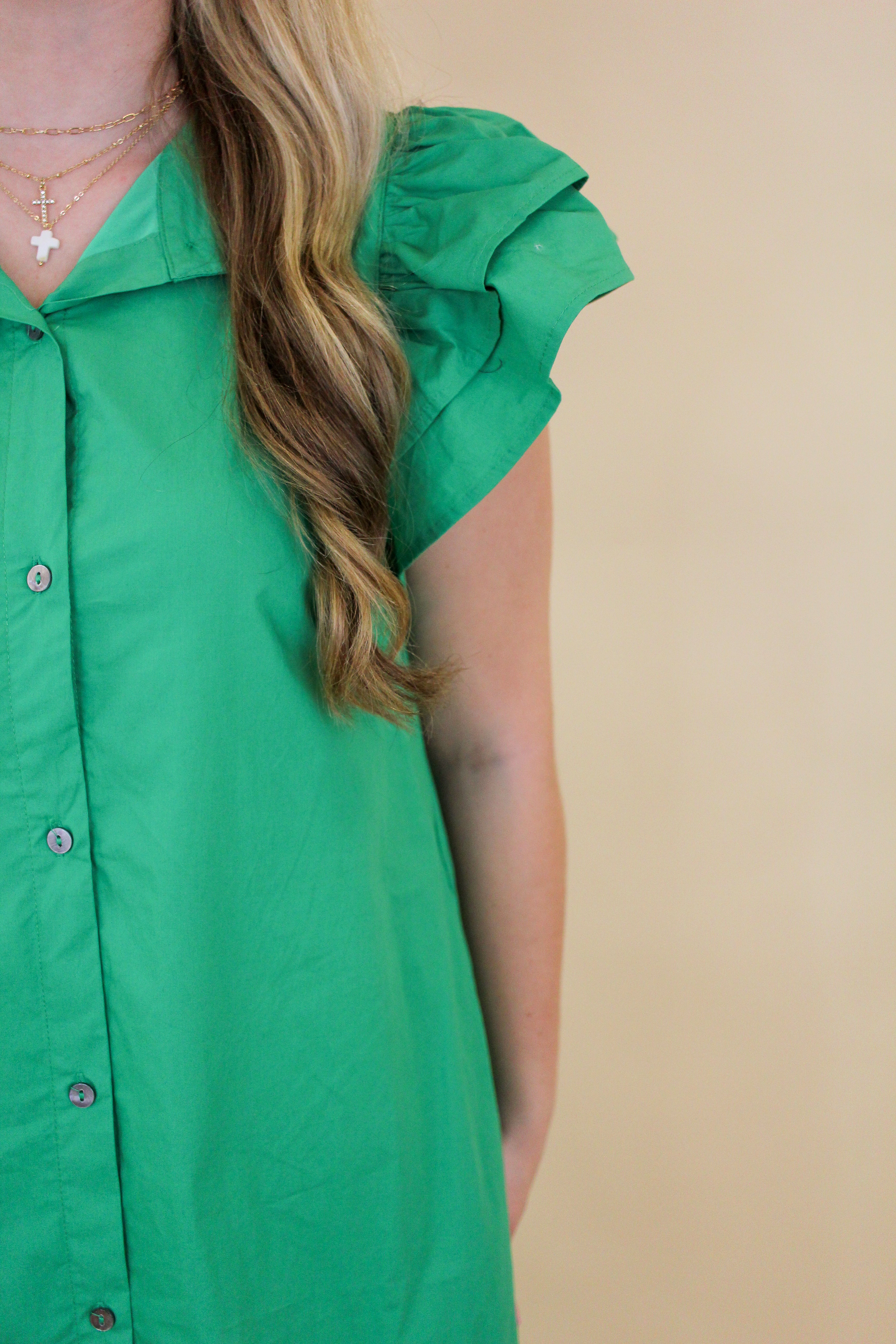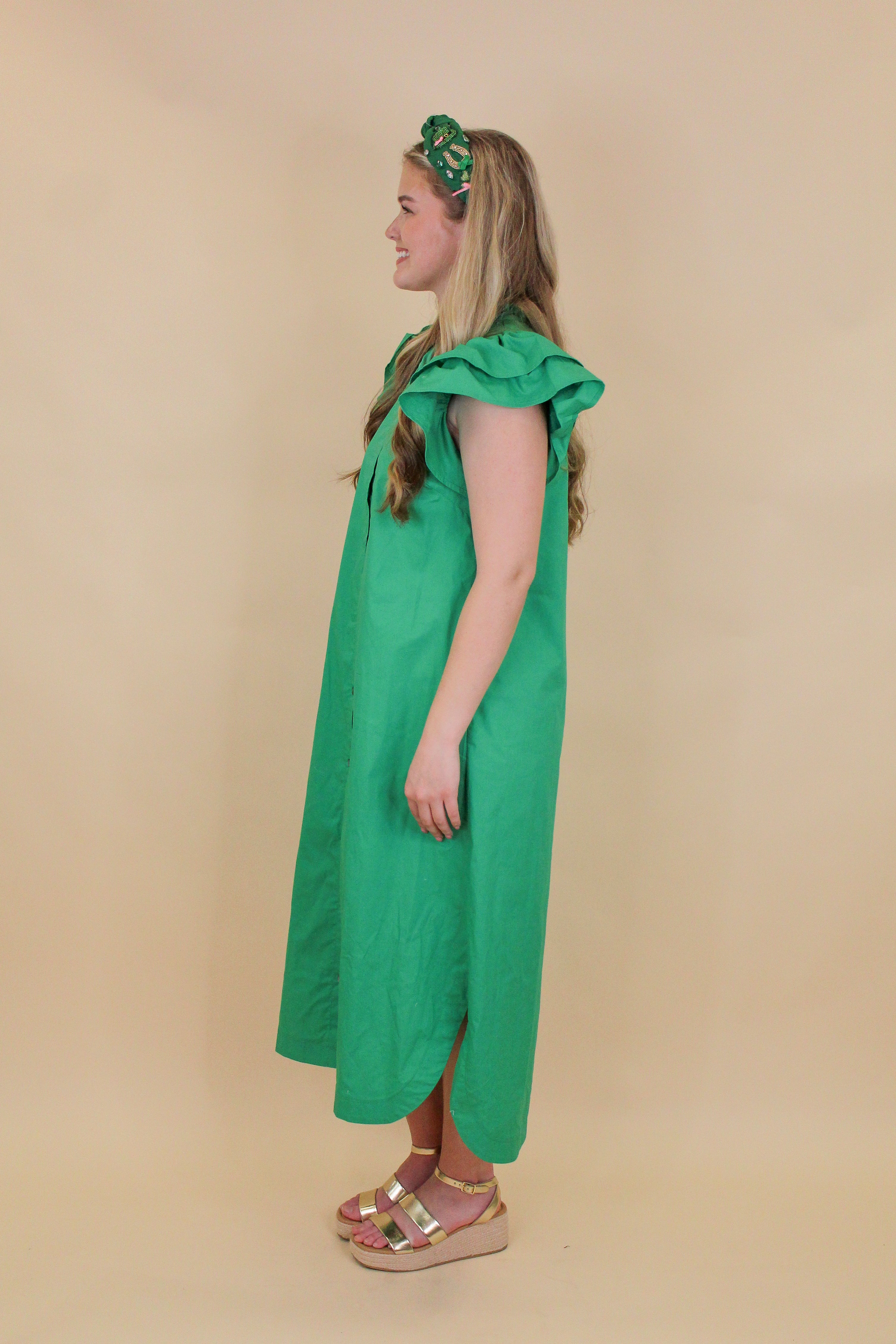 This vibrant green midi dress is the perfect mix of classic and statement. Featuring a full button-down front, structured collar, and dramatic ruffle sleeves, it’s effortlessly polished with just the right amount of flair. The midi length gives it a timeless feel while still being fun and fresh.