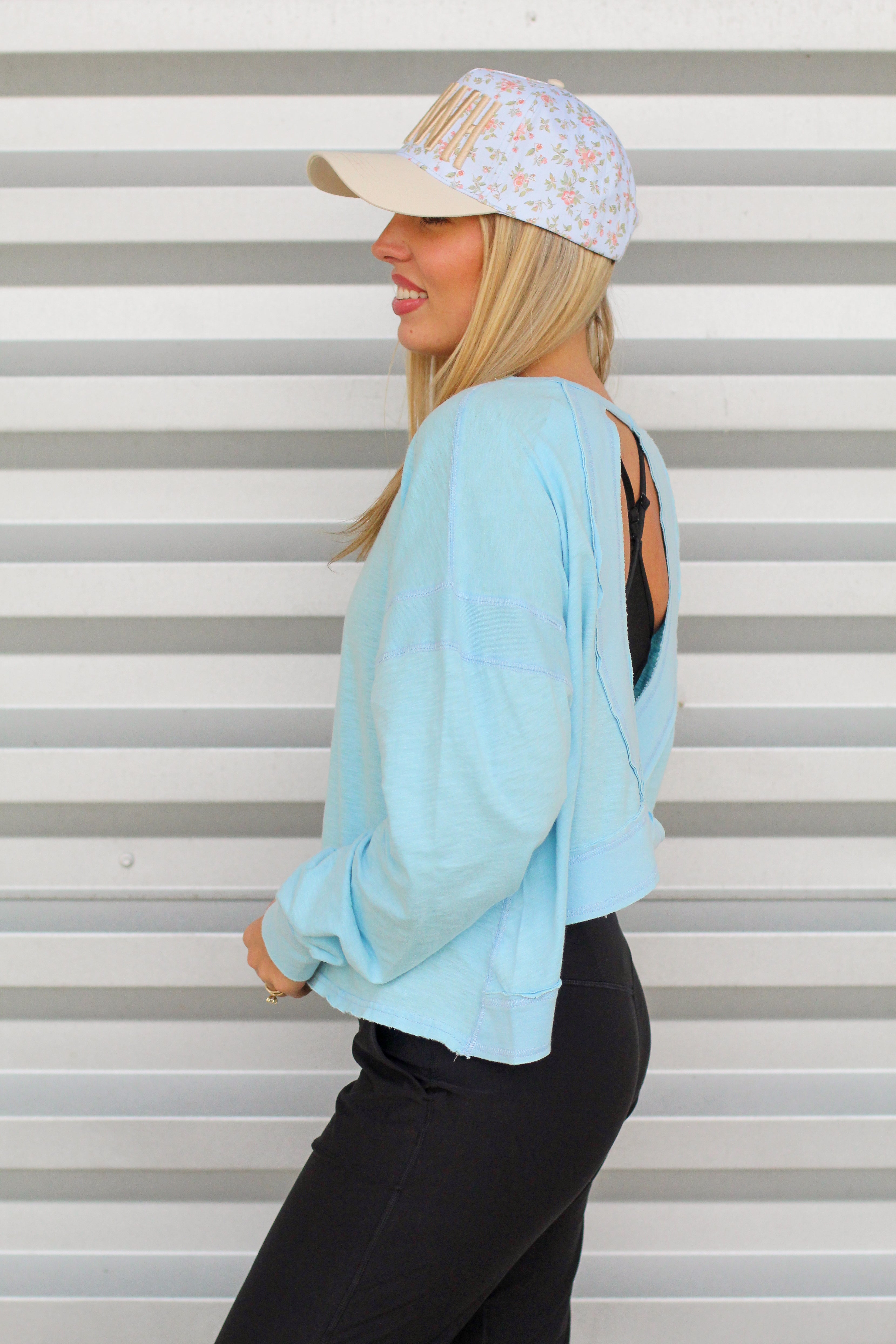 The standout detail? A bold open-back design with a curved cutout that shows off your favorite bralette or sports bra. It adds the perfect sporty-chic touch while keeping the look breathable and easy to layer. The raw-edge seam detailing gives it that laid-back, lived-in feel we love.
